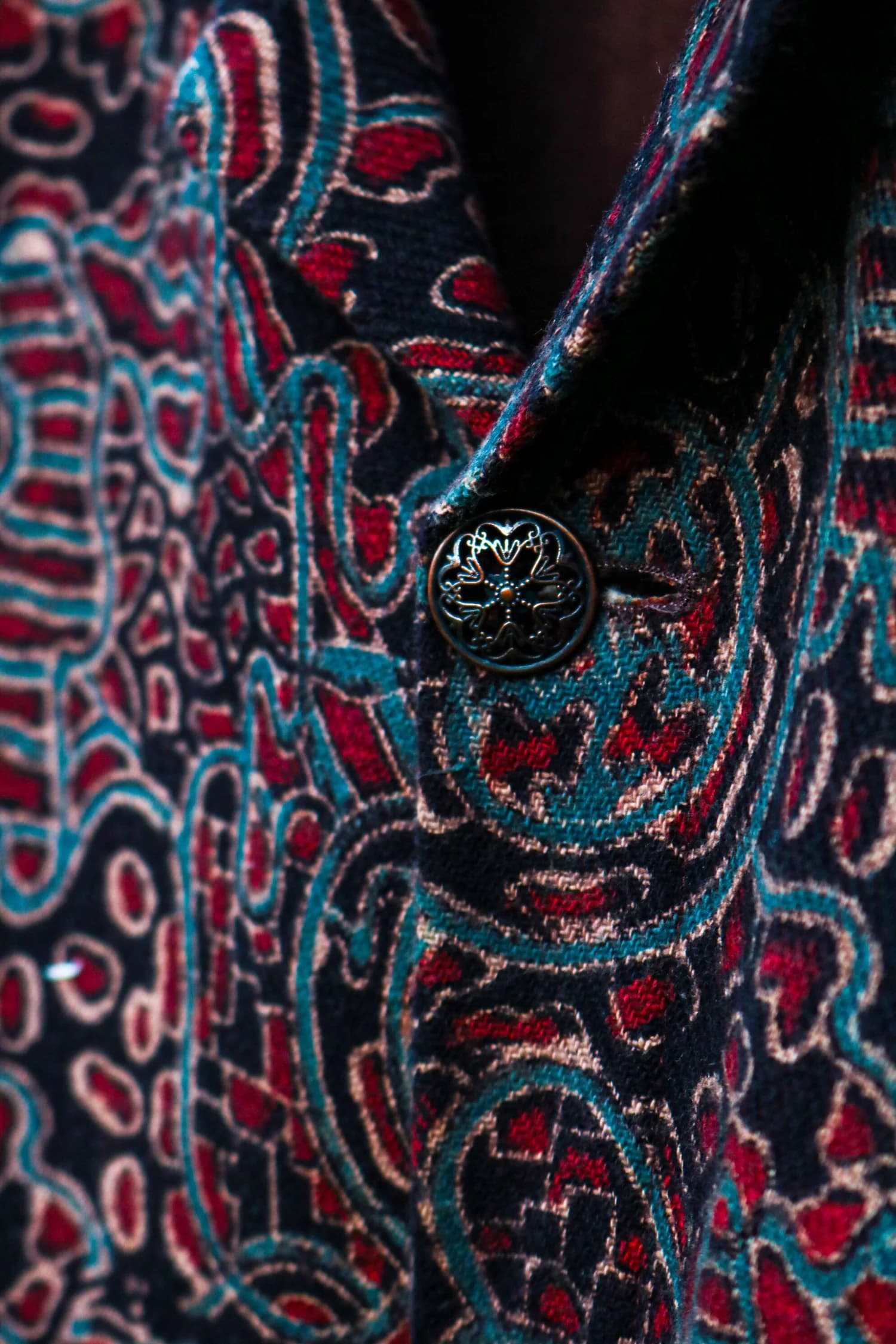 Layer up loud: a kala-cotton denim jacket splashed in hand-blocked Ajrakh motifs—heritage print meets sharp modern cut for effortless, art-charged swagger.