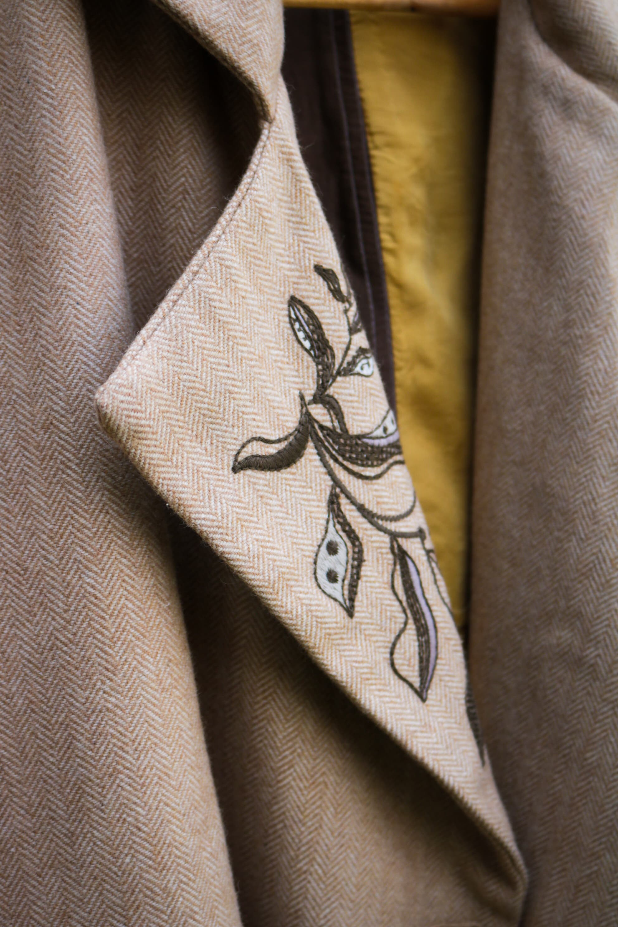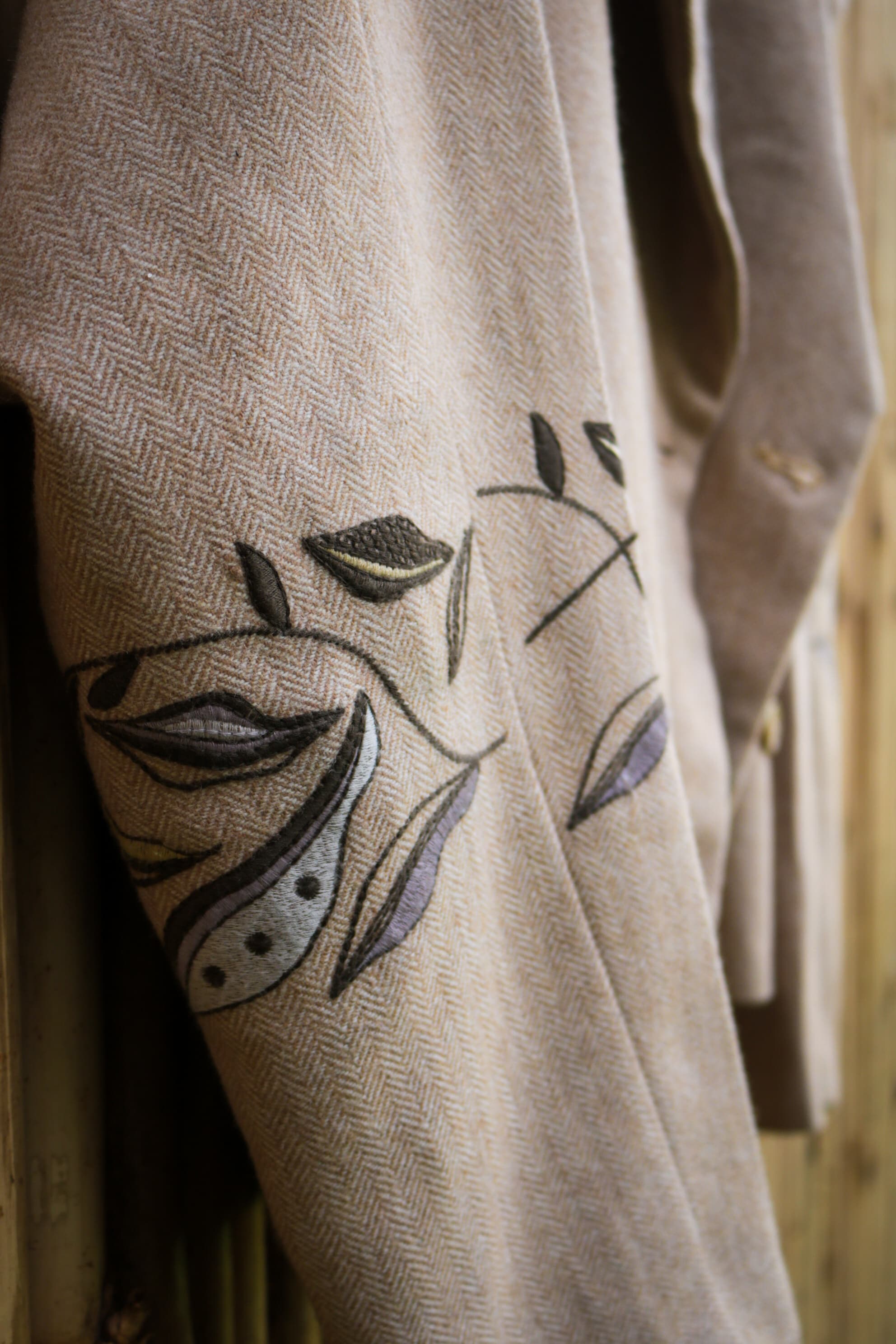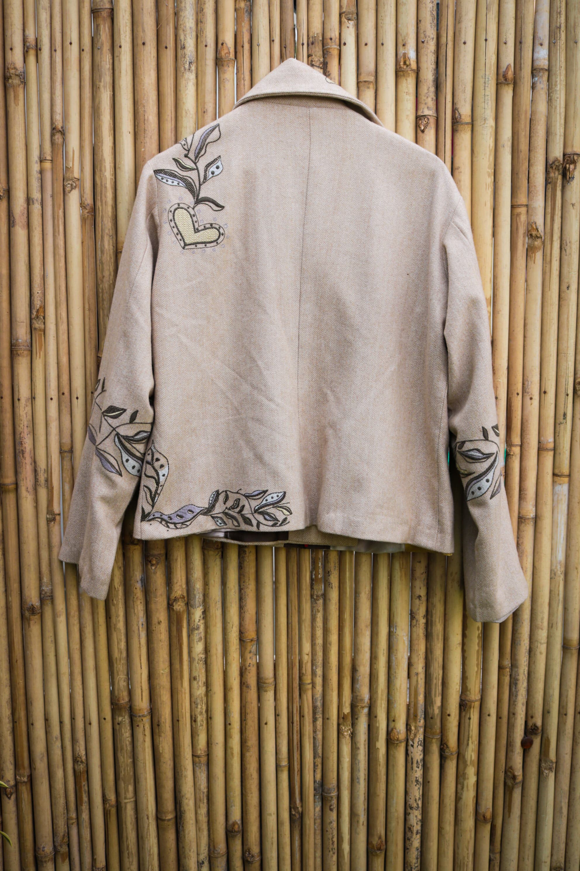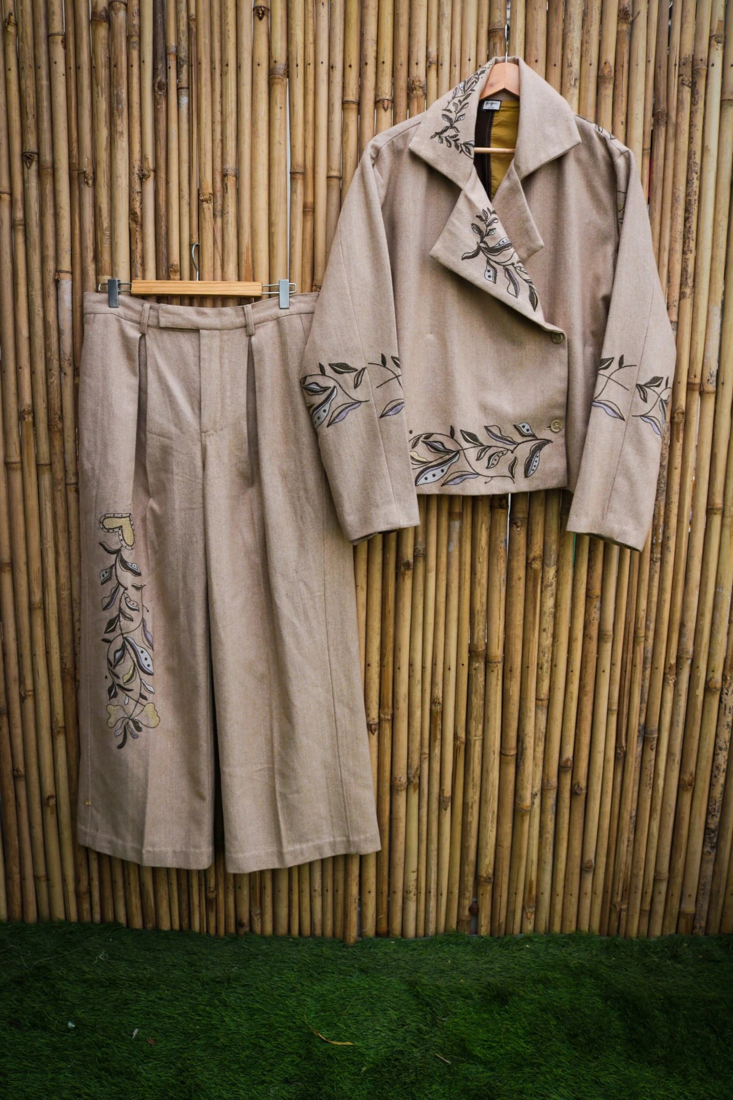 Introducing a distinguished creation from HeenaAgrima: a beige yak wool double-breasted jacket paired with perfectly tailored trousers, both embroidered with the brand's latest Heart Tree artwork. This ensemble marries classic tailoring with contemporary artistry, where each stitch reflects a deep respect for heritage and innovation. The rich texture of the yak wool offers a refined elegance, while the intricate embroidery evokes a sense of timeless beauty. Designed for those who appreciate the quiet luxury of exceptional craftsmanship, this set is an investment in both style and legacy.