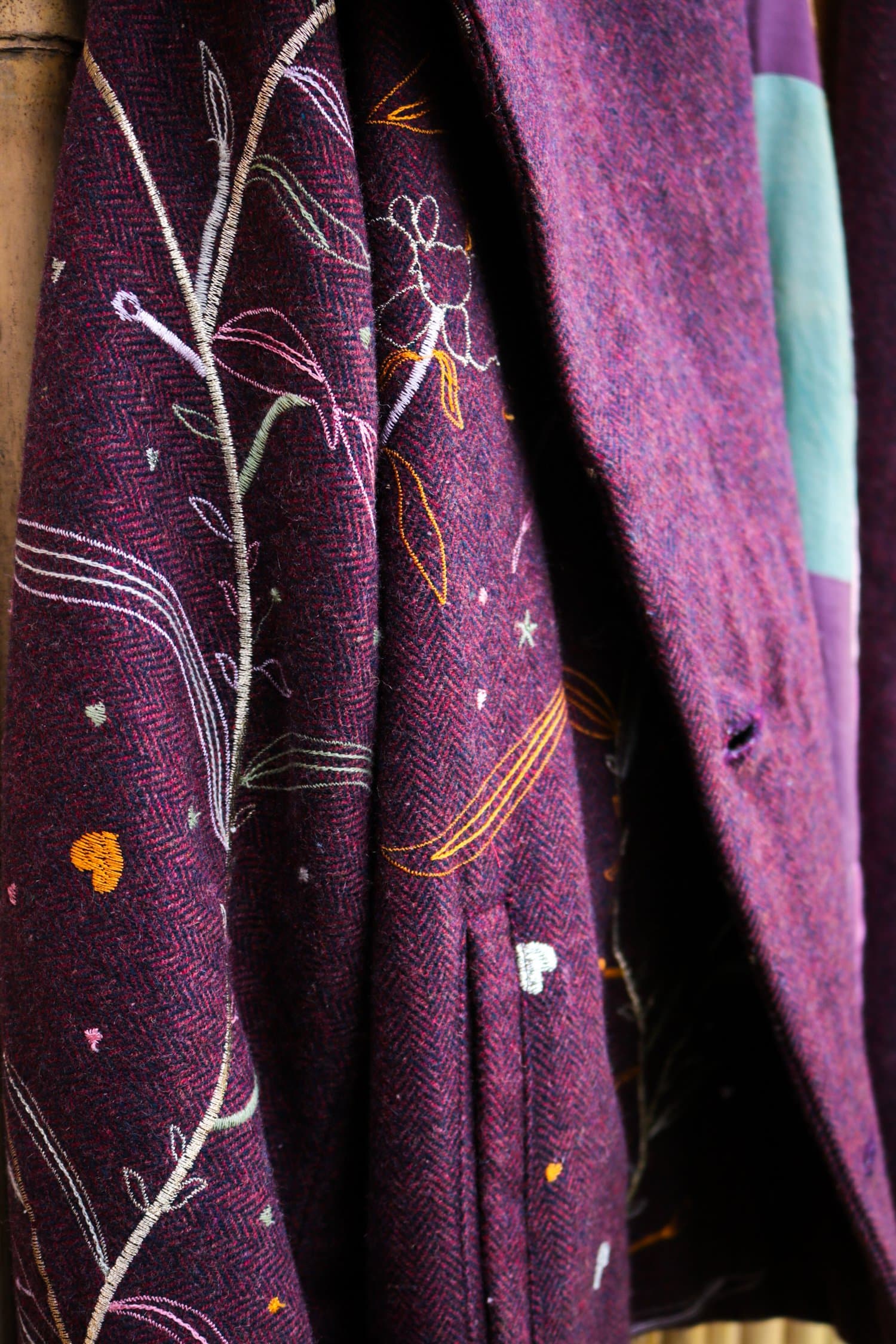 Introducing an exquisite masterpiece from HeenaAgrima: a purple yak wool peacoat, meticulously crafted to exude timeless sophistication. The luxurious fabric, chosen for its unparalleled warmth and softness, is elevated by delicate embroidery of HeenaAgrima's signature Queen’s Bagh floral motif—a nod to regal artistry and heritage. This coat is more than just outerwear; it is a statement of refinement, blending rich tradition with modern elegance, designed for those who appreciate the finest in craftsmanship and design. A true heirloom piece for the discerning few.