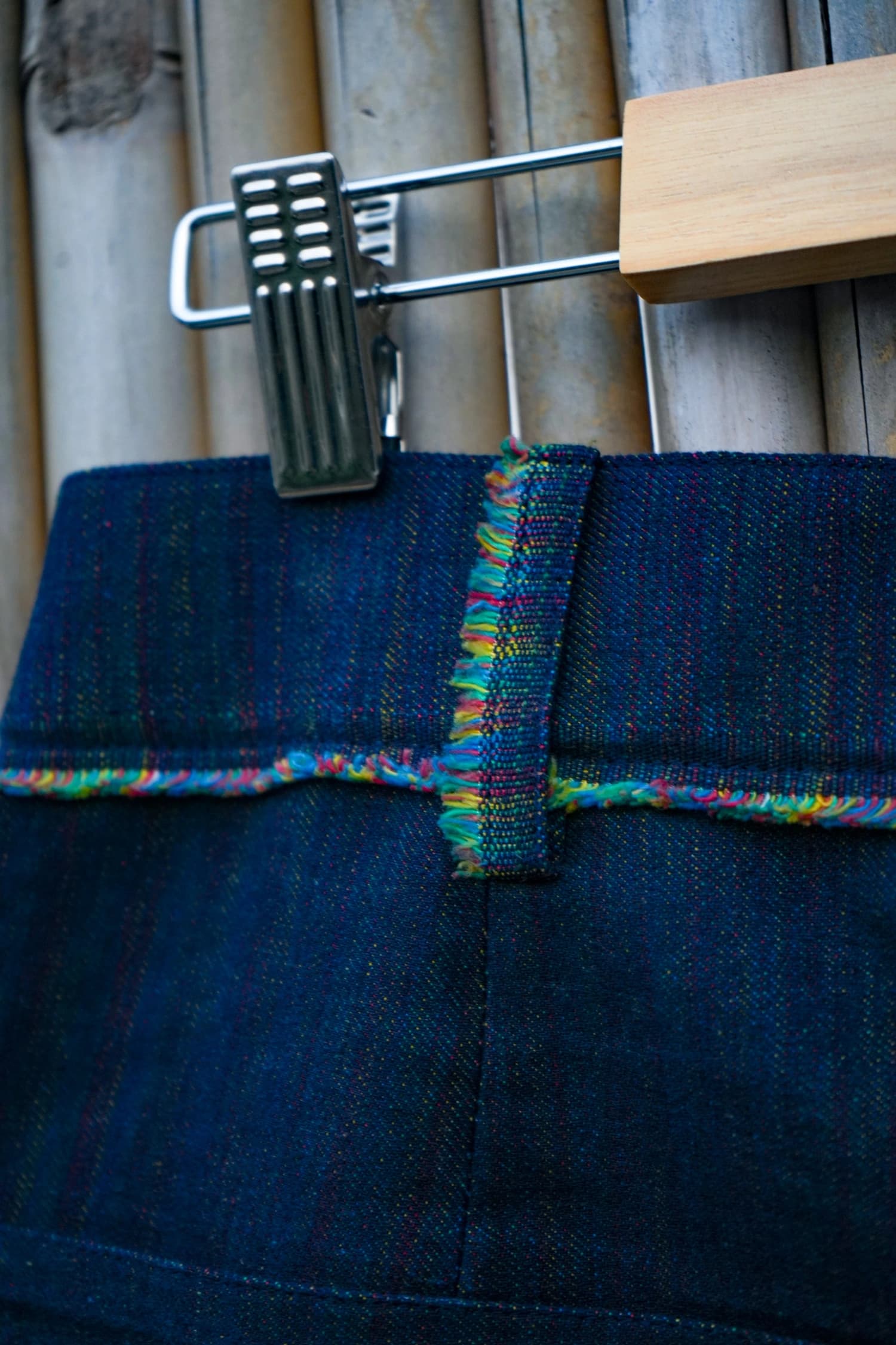 Crafted from rainbow double-sided denim, these trousers feature intricate hand-done beadwork inspired by wild florals. Finished with a relaxed silhouette, they blend playful texture with thoughtful craftsmanship for an elevated everyday statement.