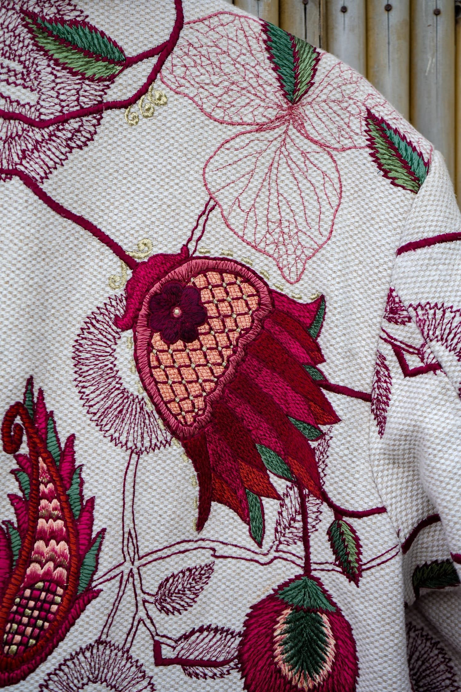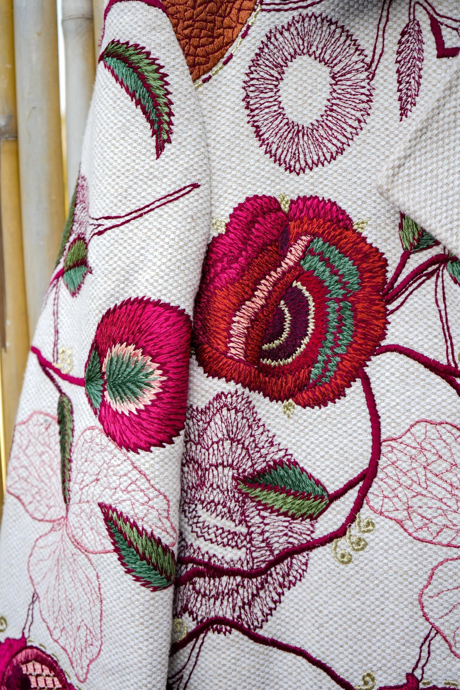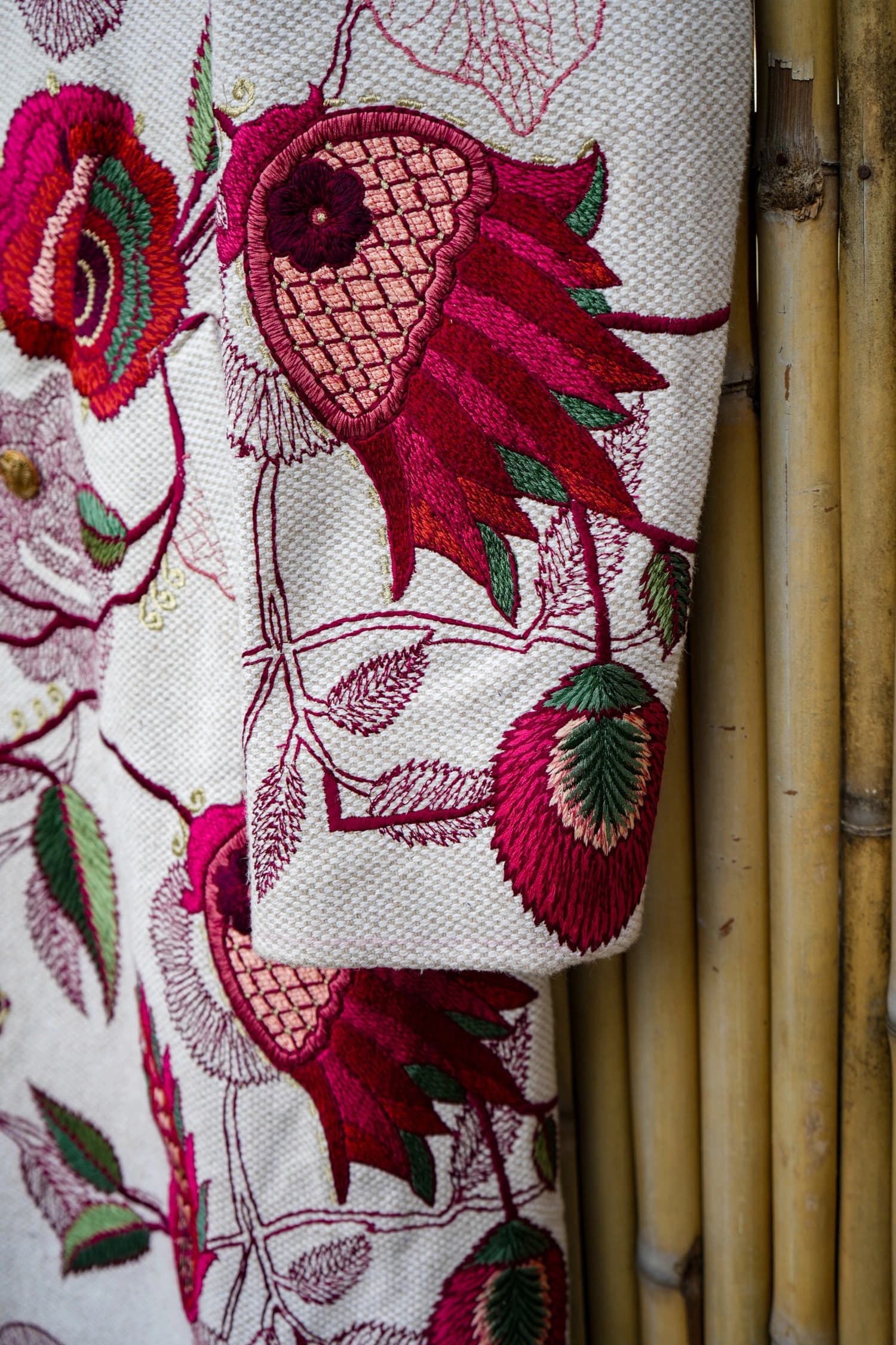 A longline hemp–cotton coat brought to life with intricate machine embroidery, blooming in rich pomegranate reds and forest greens over a textured ivory base. Structured yet romantic, it balances earthy craft with bold botanical drama.