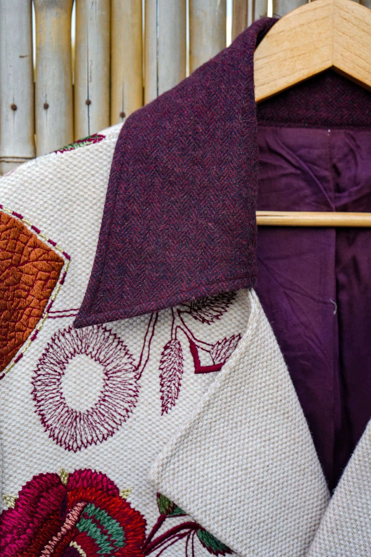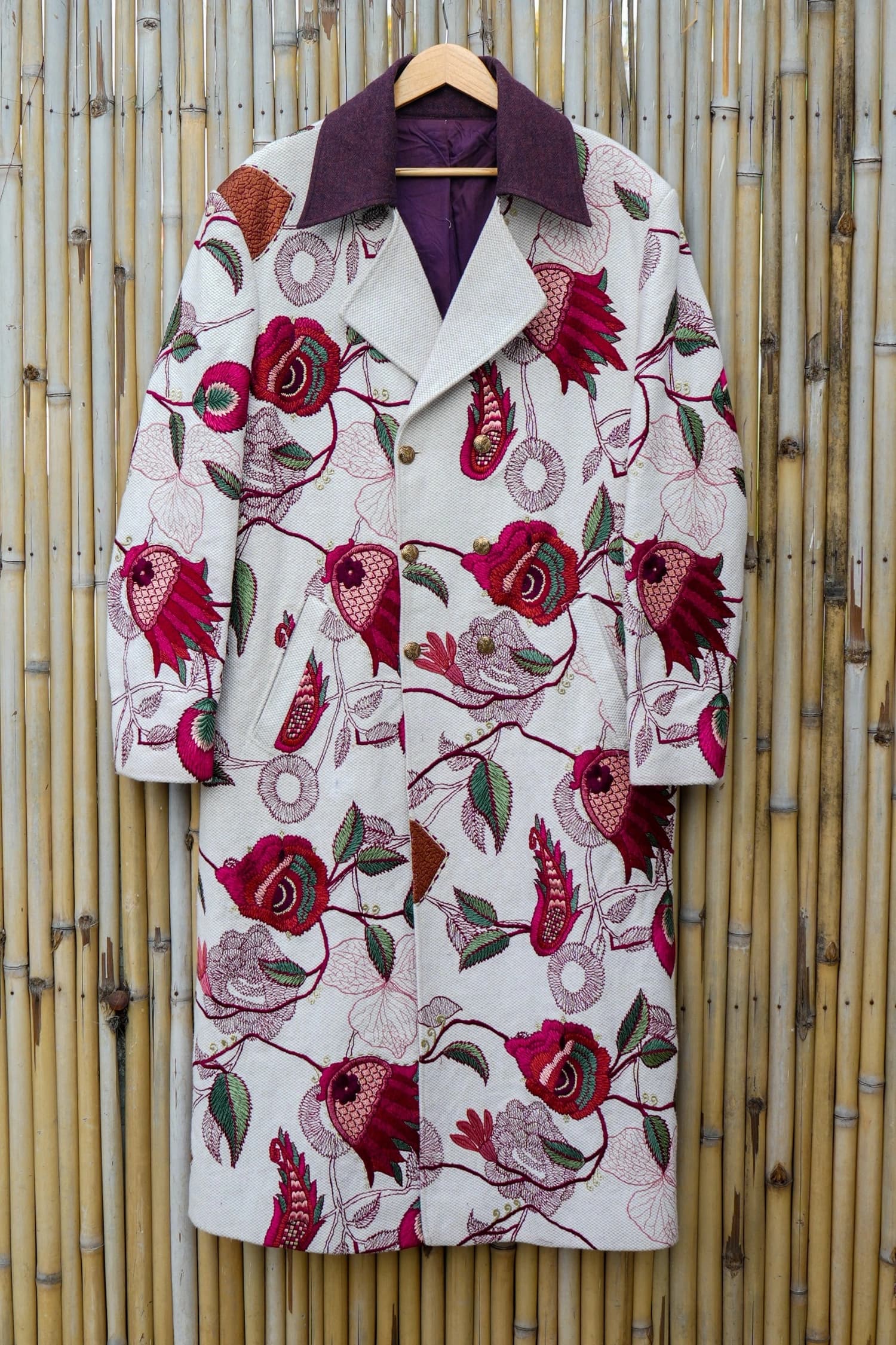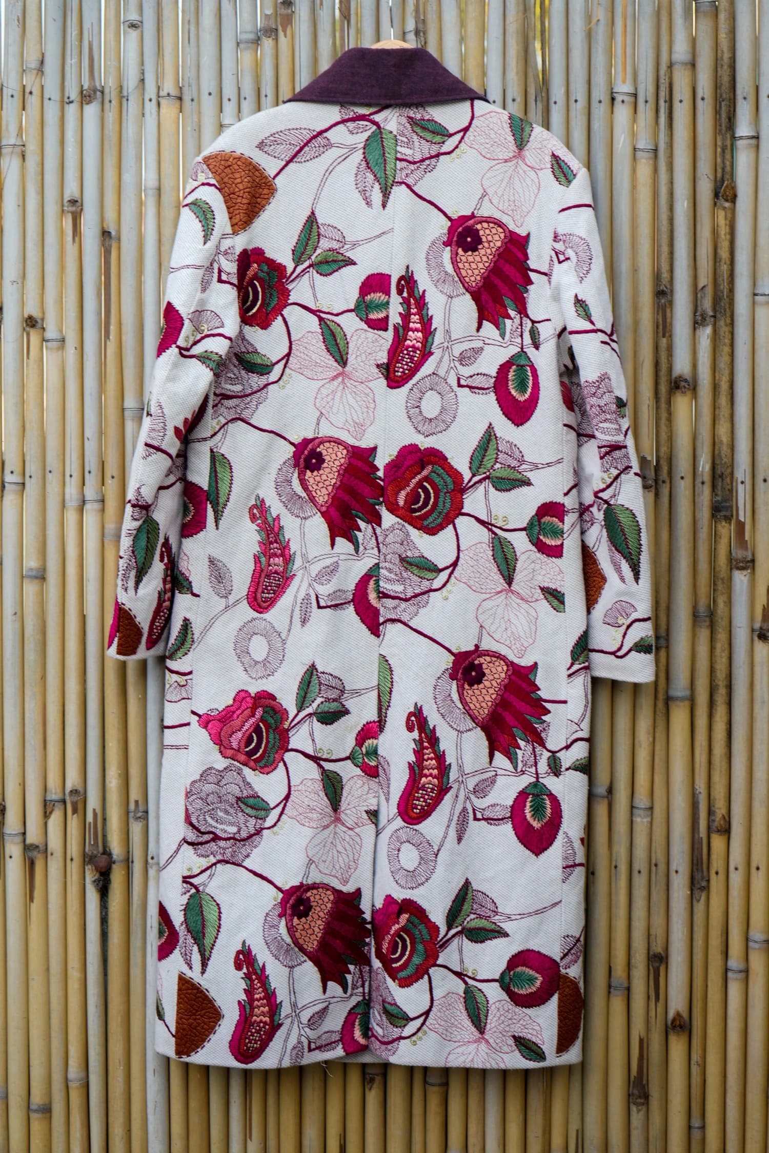 A longline hemp–cotton coat brought to life with intricate machine embroidery, blooming in rich pomegranate reds and forest greens over a textured ivory base. Structured yet romantic, it balances earthy craft with bold botanical drama.