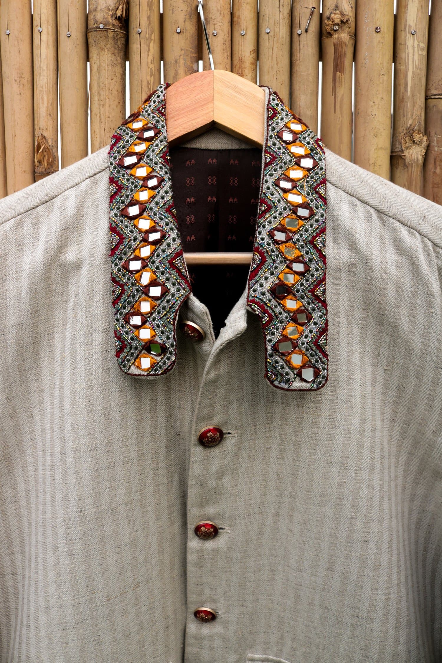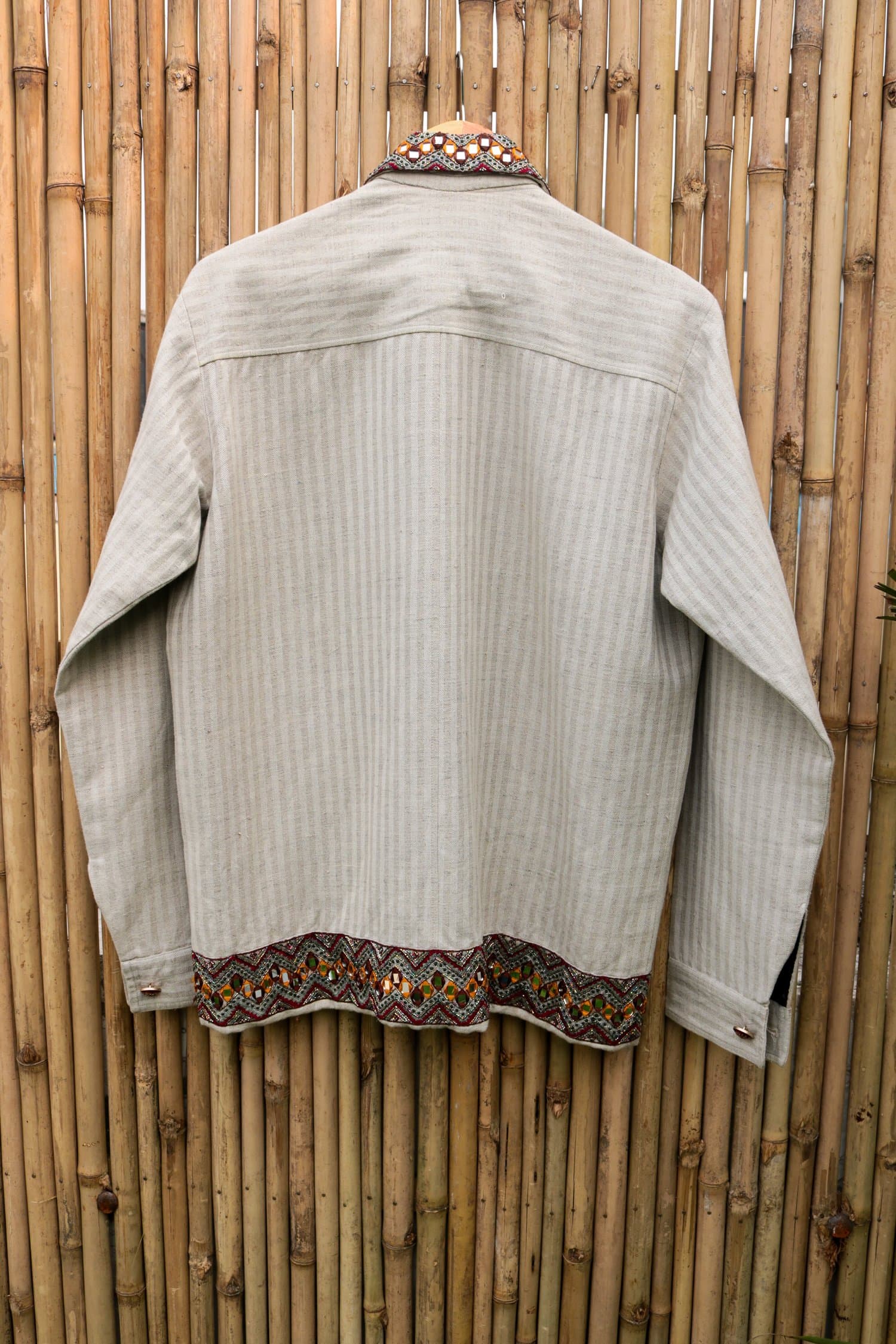 Crafted from premium hemp cotton in a herringbone weave and lined with luxurious silk, the Jaipur Jewel Jacket is a masterpiece of style and heritage. Adorned with striking red enamel buttons, this jacket exudes a sophisticated elegance. Featuring hand-embroidered bead, thread, and mirror work inspired by traditional patterns of Rajasthan, it’s a rich tapestry of East meets West.