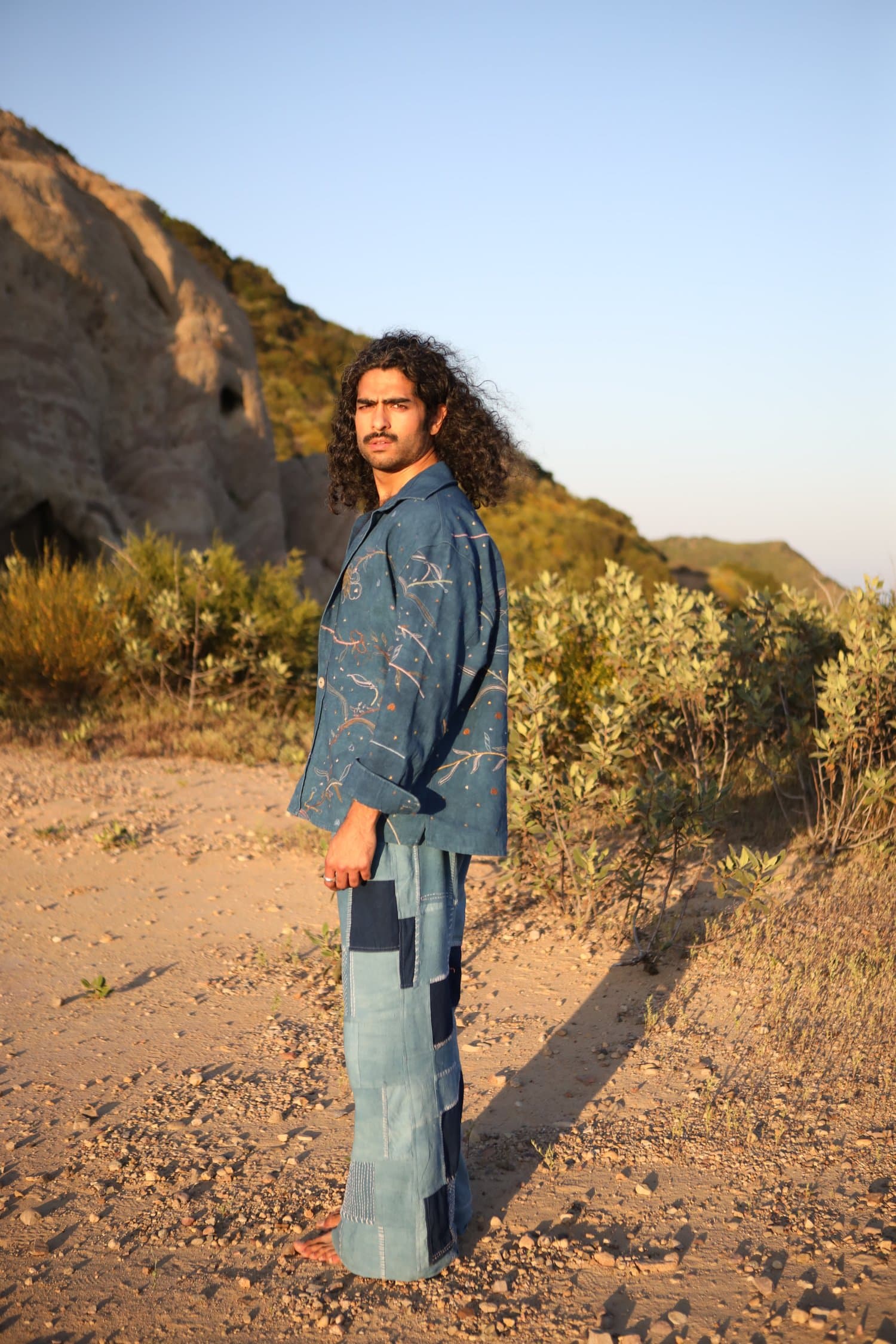 Presenting the "King's Bagh Overshirt," a stunning collaboration between Heena Agrima and Morni Studios. Crafted from luxurious Khadi fabric and dyed with 100% natural plant-based indigo, this versatile piece is perfect as both a shirt and an overshirt. The intricate machine embroidery showcases exquisite craftsmanship, making it a standout summer statement piece.
