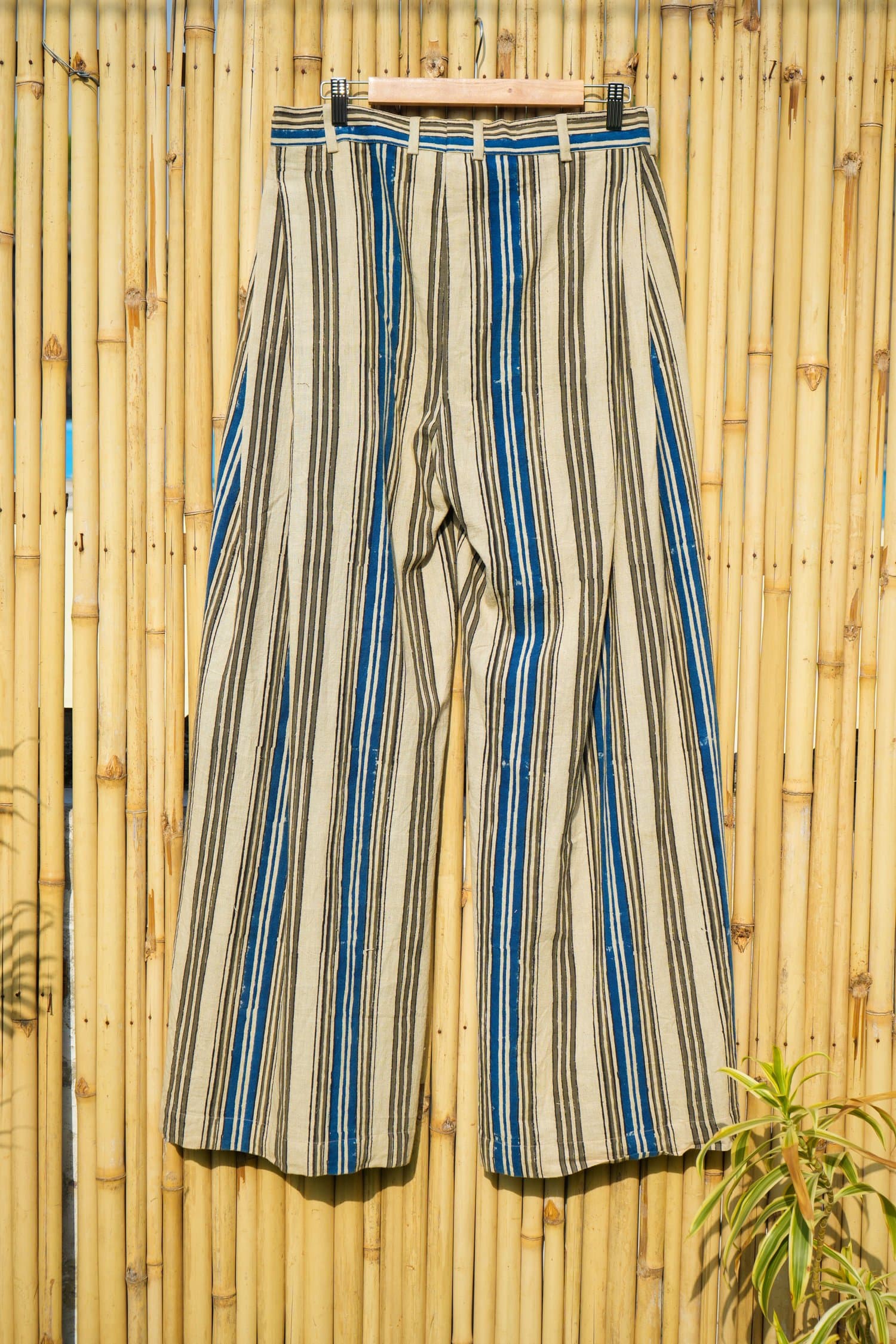 These wide-legged pants are crafted from handwoven kala cotton and feature a natural striped Ajrakh-style print, created by multi-generational artisans from Kachchh, Gujarat. Designed with multiple pleats for an airy, sculptural silhouette, the extended length adds a dramatic effect — giving the illusion of floating just above the ground. Each pair carries the soul of centuries-old dyeing techniques, merging grounded heritage with an ethereal vibe.
