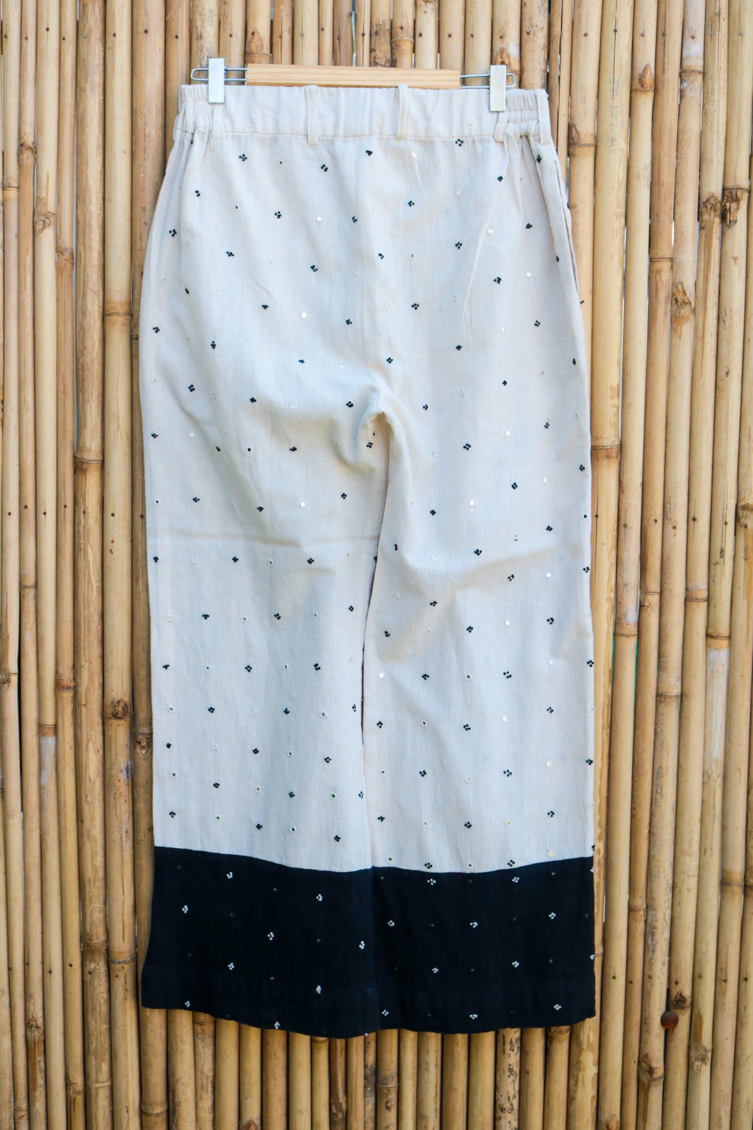 Crafted from soft kala cotton, these loose pants exude effortless elegance, adorned with intricate hand embroidery of mirrors and French knots. A perfect fusion of tradition and style, they offer a sophisticated yet relaxed fit for any occasion.