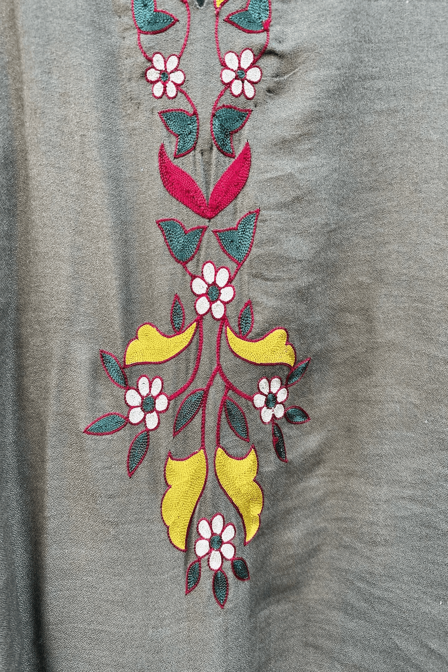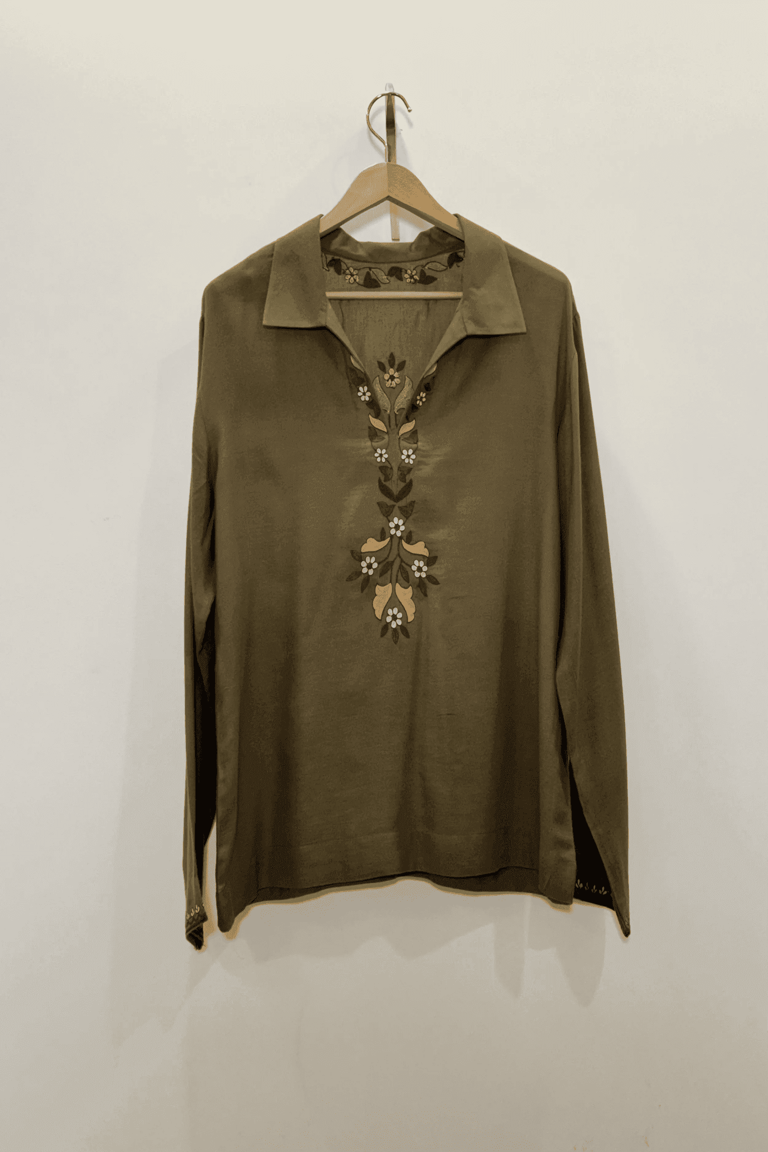 A relaxed olive top crowned with a soft collar and deep V-split neckline, where a vertical vine of mustard, crimson, and ivory florals climbs like a page torn from a 17th-century Mughal folio—quietly regal, effortlessly modern.