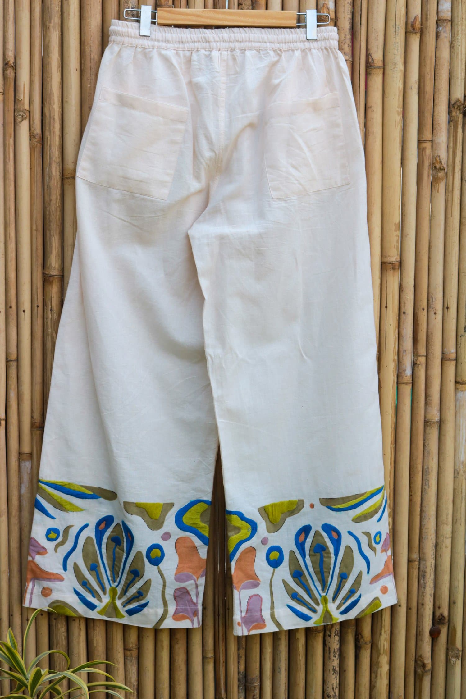 These linen pants are a true work of art, hand-painted and embroidered with a vibrant peacock and mushroom design. The lightweight, breathable fabric keeps things comfortable, while the bold artwork adds a creative flair to your style. A perfect balance of casual comfort and unique expression.