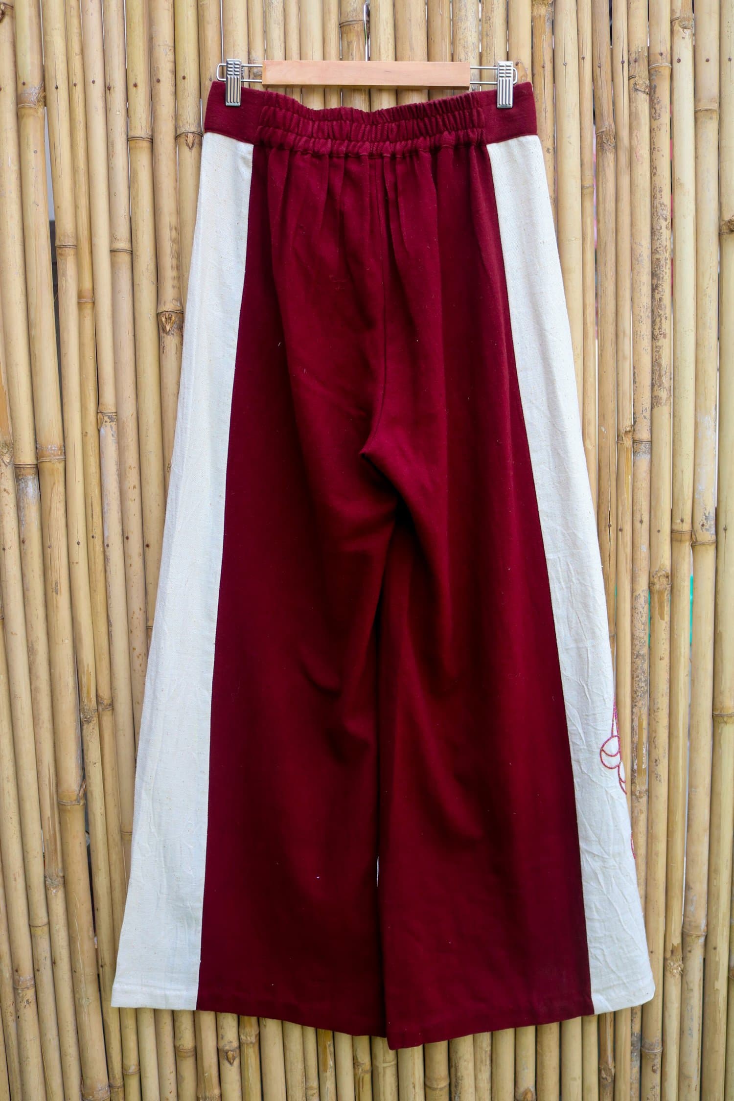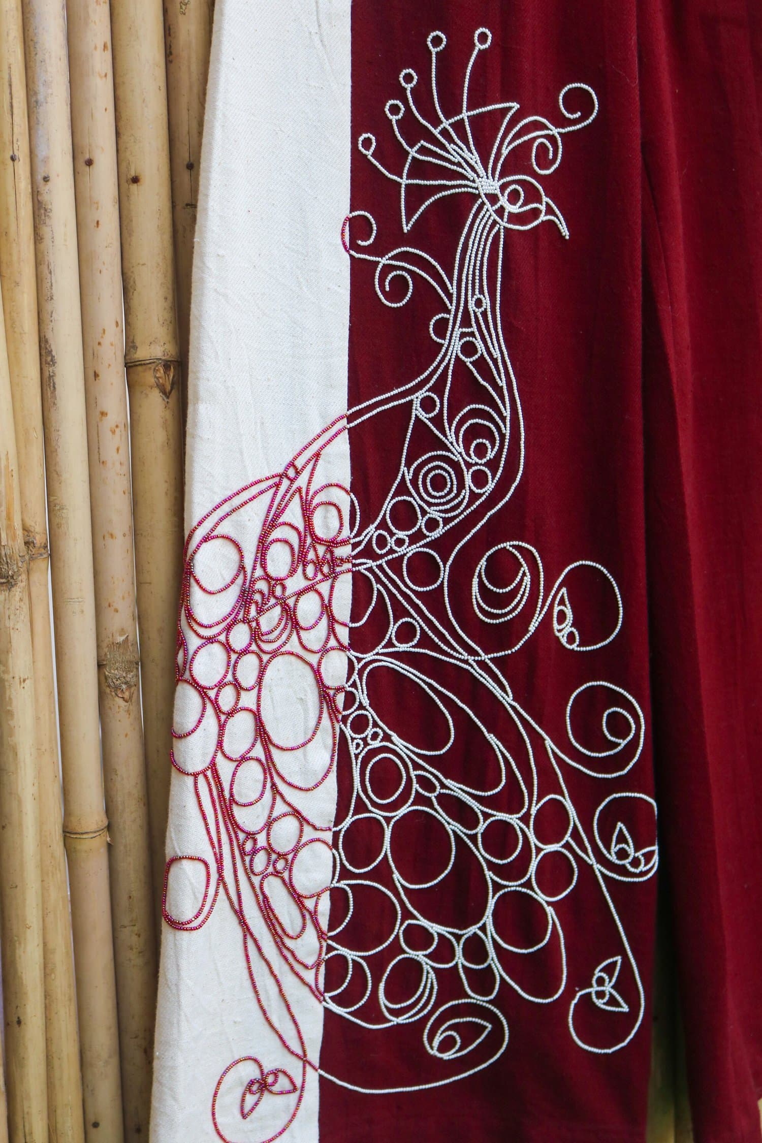 These Panel Pants are a stunning blend of artistry and elegance. Featuring striking red and white panels, they are adorned with contrasting beads that form a breathtaking peacock artwork, meticulously crafted by artist Anand Mohapatra. The intricate beadwork adds depth and dimension, transforming these pants into a wearable masterpiece that celebrates both color and craftsmanship.