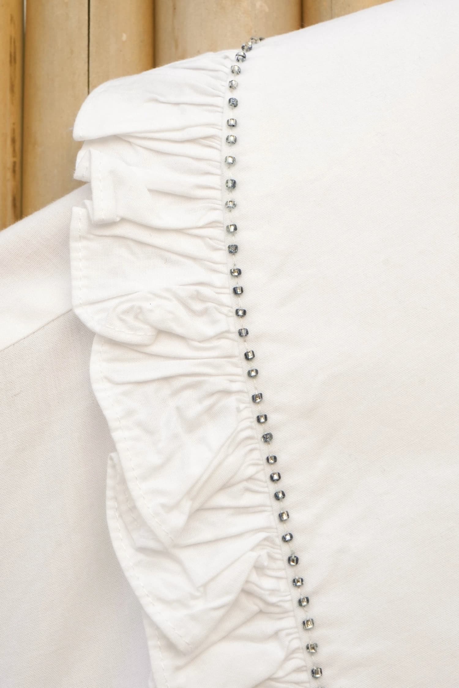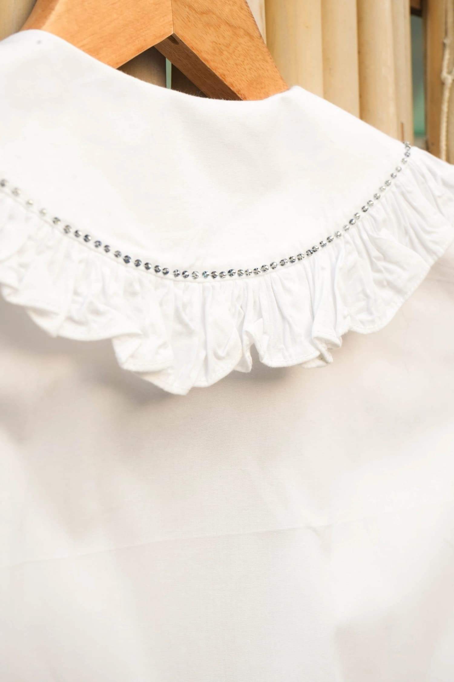 A crisp white shirt featuring a soft frill collar with delicate bead detailing. Elegant, lightweight, and thoughtfully crafted for a refined yet effortless look.