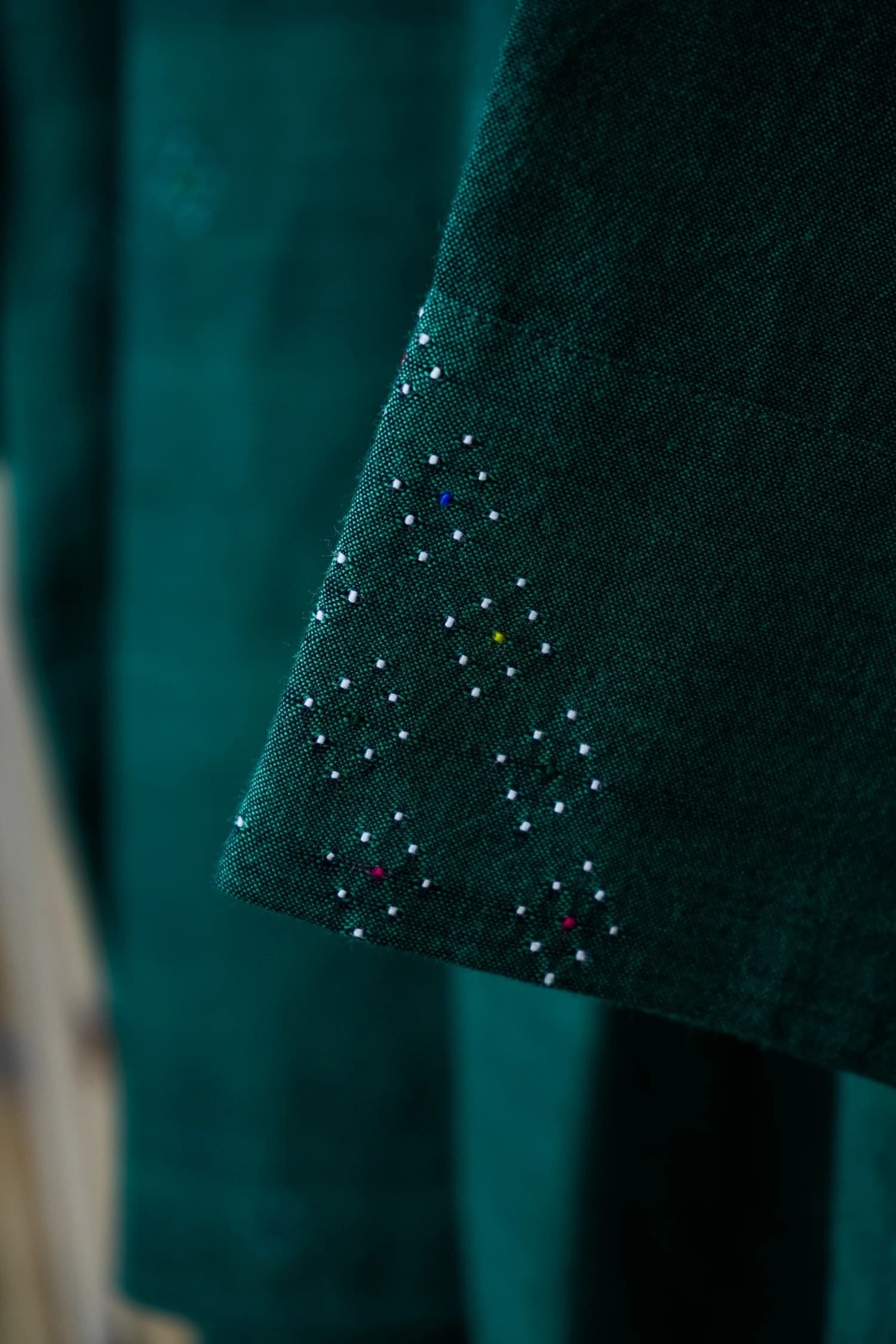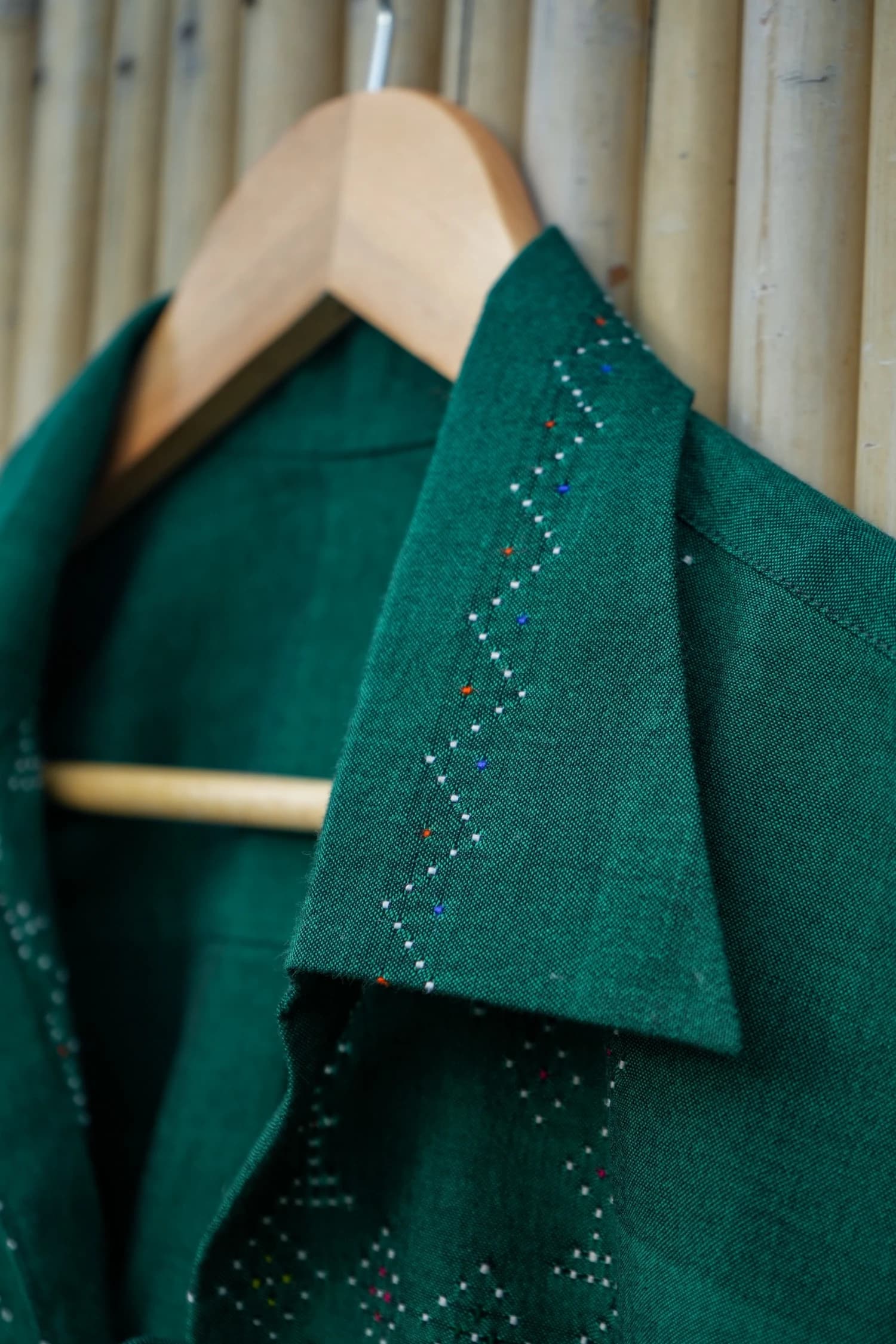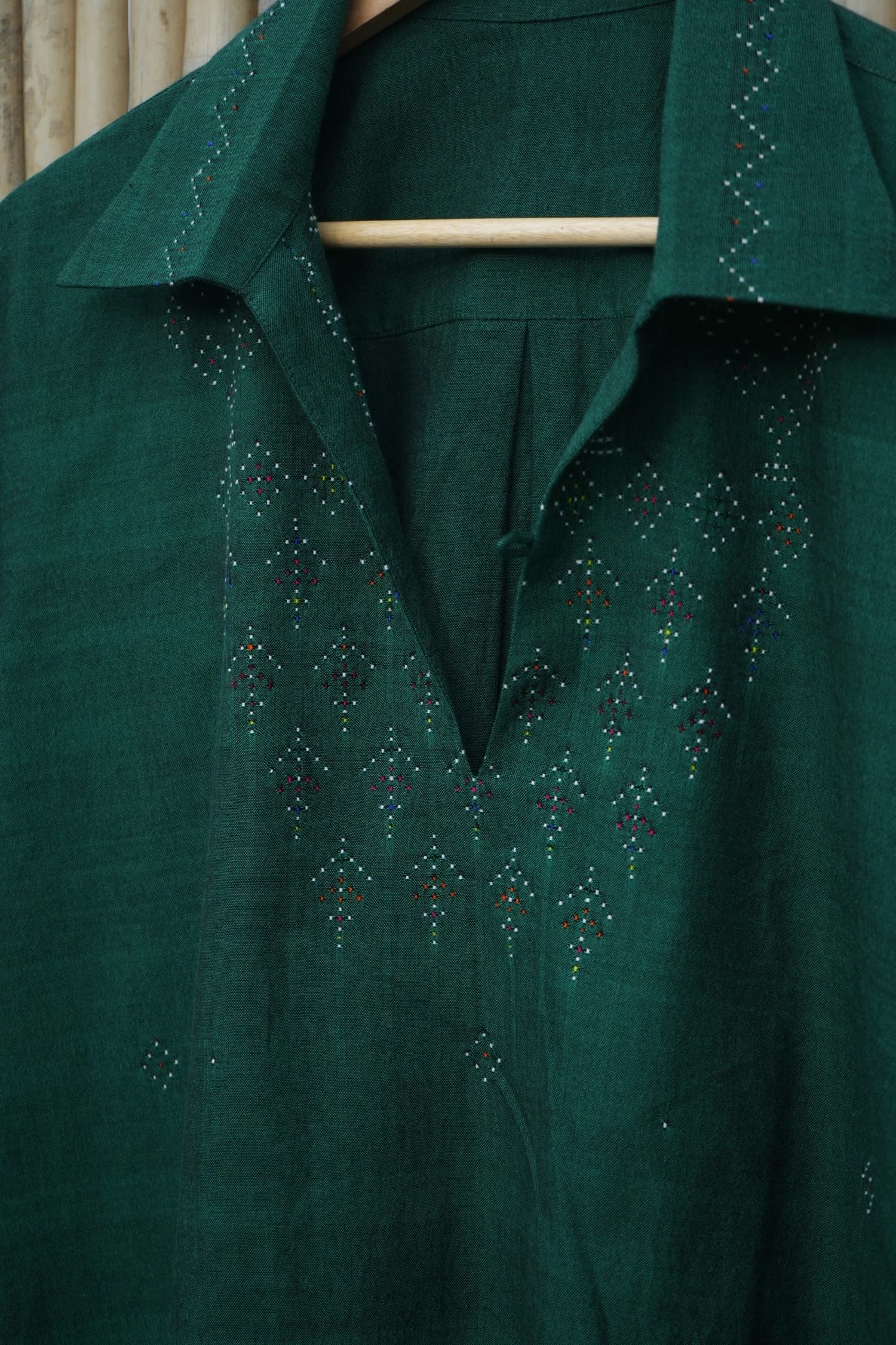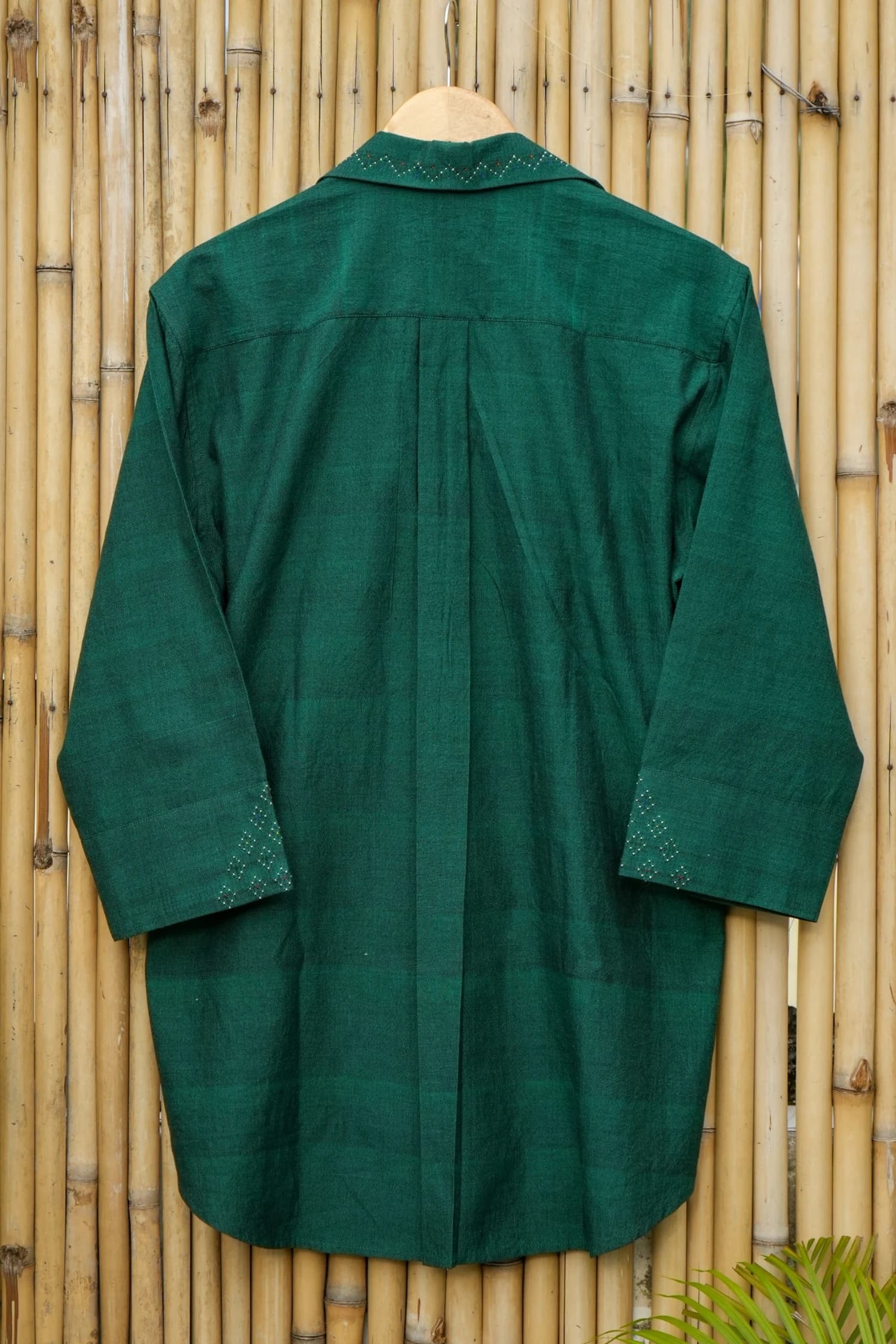 Crafted in breathable Kala cotton, the fabric feels airy yet substantial, with a soft hand and a naturally textured weave that adds depth to its relaxed, longline silhouette and structured collar.