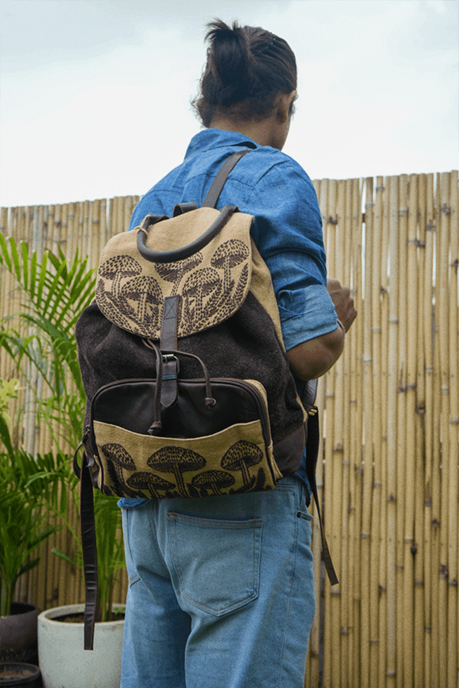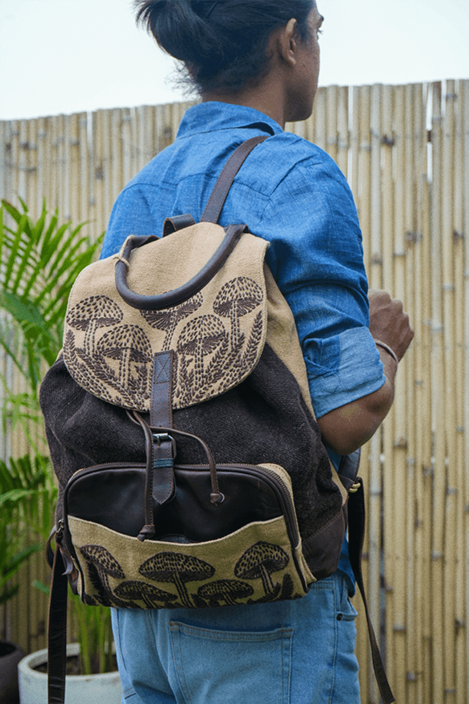 Meet The Awkward Cousin feat. Mushrooms — a backpack that doesn't try to blend in. Designed in collaboration with The Burlap People, this piece is crafted from rugged jute and ethically sourced local leather, bringing earthy textures to a wild, whimsical silhouette. The hand-embroidered mushrooms, rendered in single-stitch technique, are based on AI-generated artwork — a surreal marriage of nature and machine. It’s eccentric, conscious, and quietly defiant.