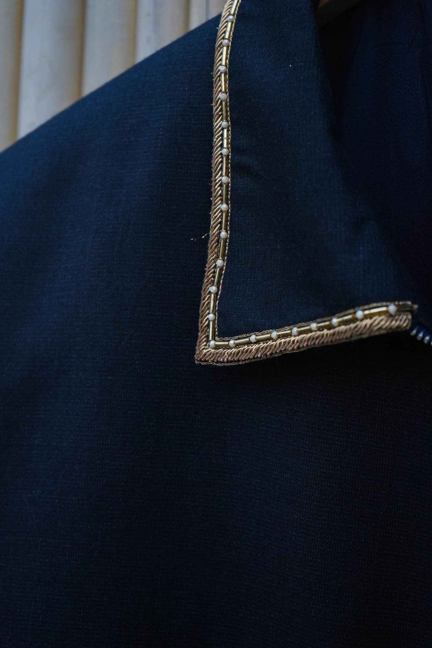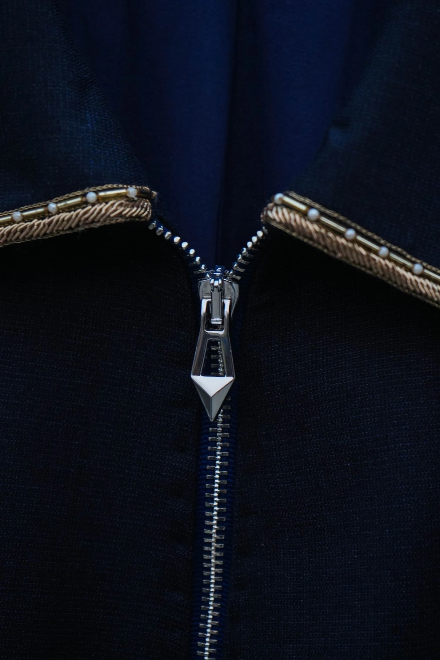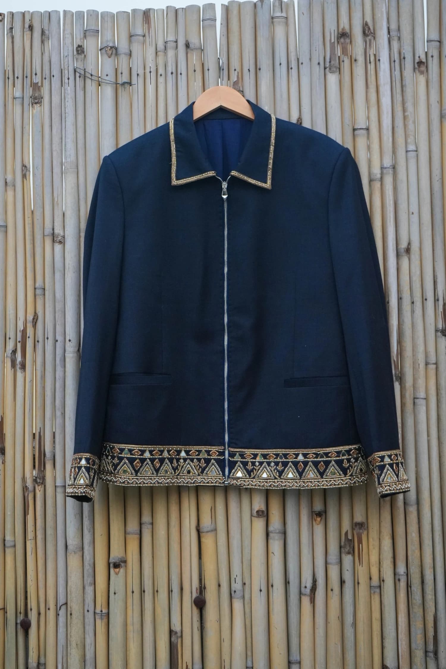 A structured navy jacket elevated with intricate hand embroidery along the collar, cuffs, and hem. Finished with a clean front zip and geometric beadwork detailing, it balances sharp tailoring with artisanal craftsmanship—designed to stand out without excess.