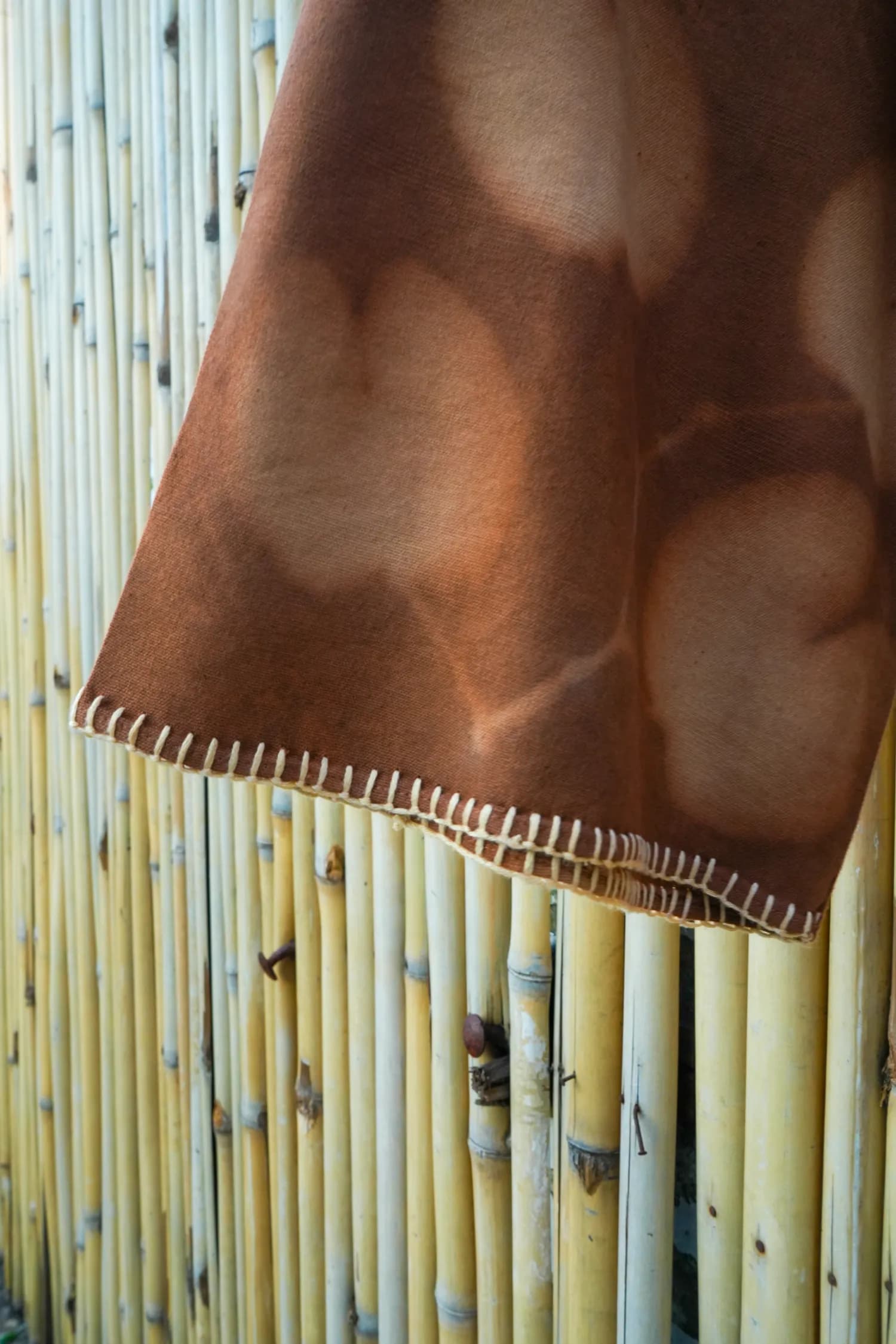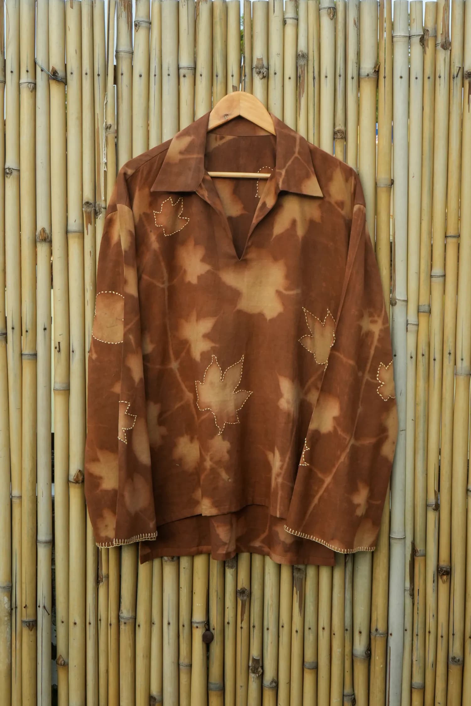 Handcrafted from banana cotton, this shirt carries the warmth of natural dyes and the delicate beauty of eco-printed leaf patterns. The Kantha stitches trace stories of tradition while adding subtle texture and strength.