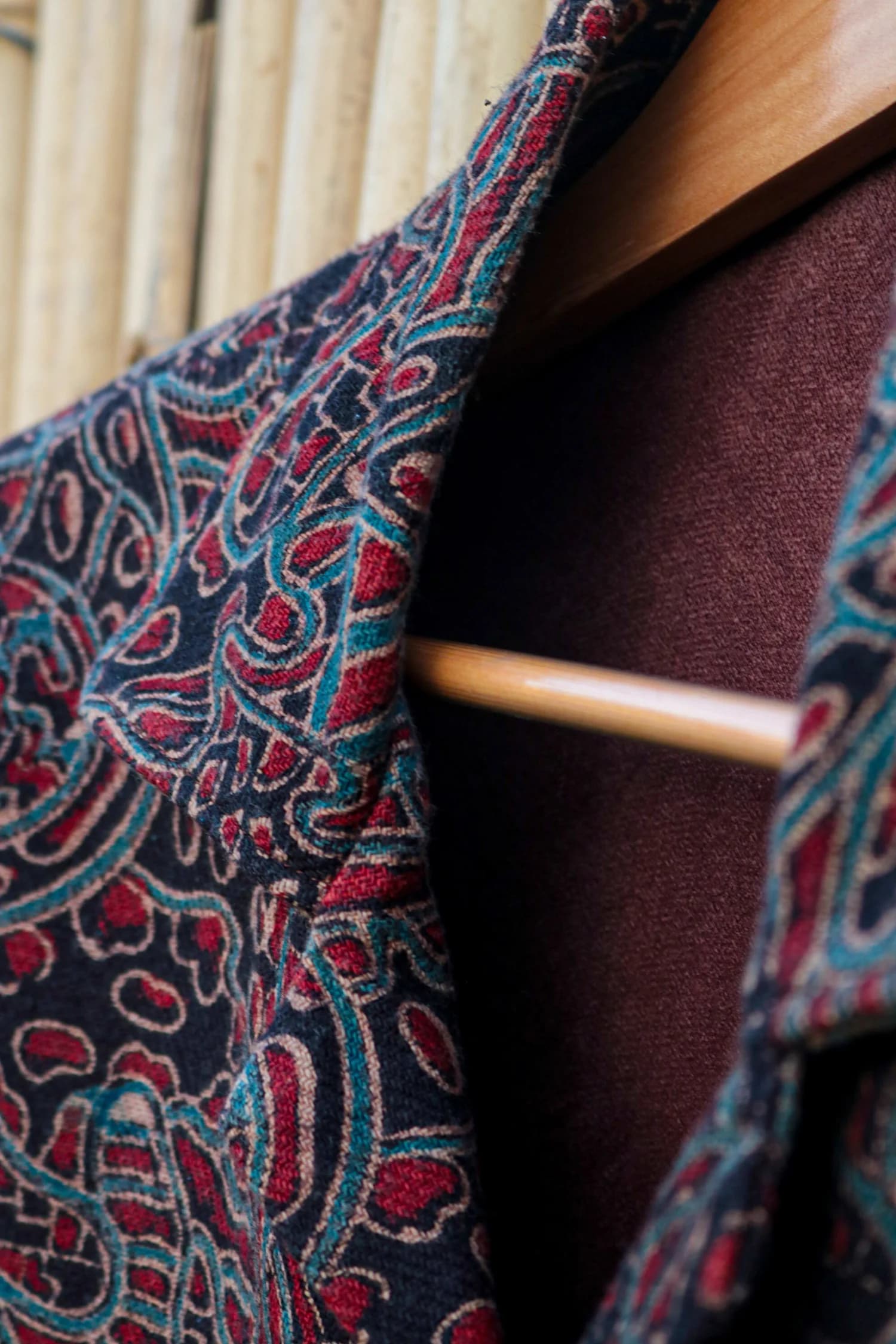 Layer up loud: a kala-cotton denim jacket splashed in hand-blocked Ajrakh motifs—heritage print meets sharp modern cut for effortless, art-charged swagger.