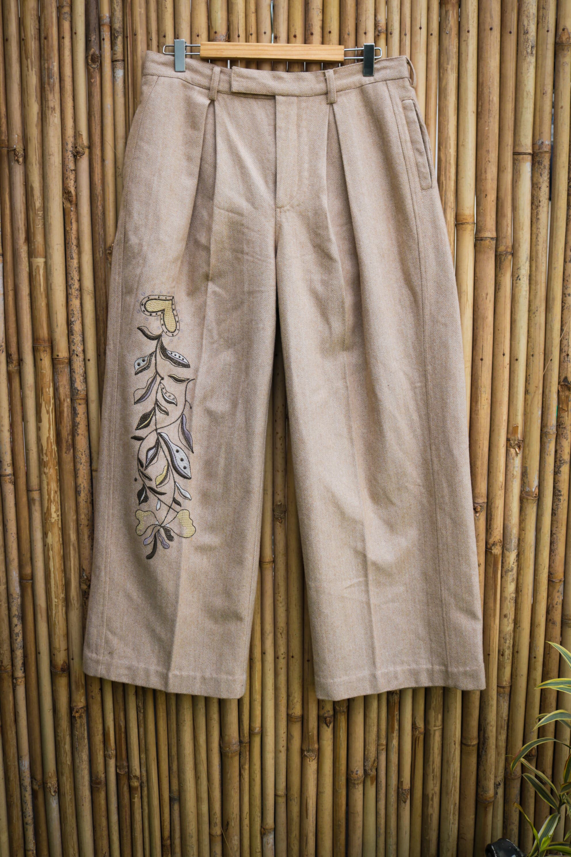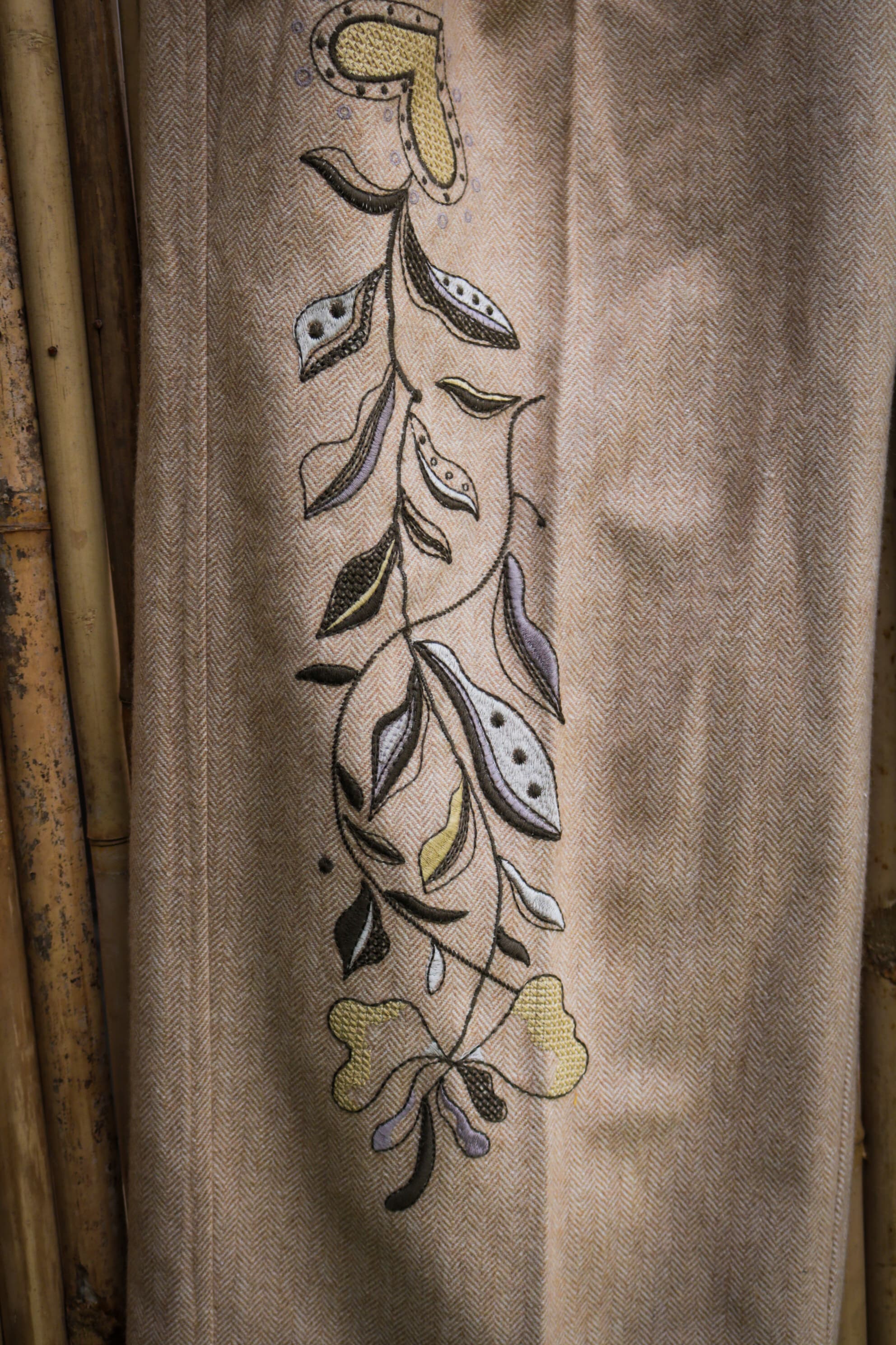 Introducing a distinguished creation from HeenaAgrima: a beige yak wool double-breasted jacket paired with perfectly tailored trousers, both embroidered with the brand's latest Heart Tree artwork. This ensemble marries classic tailoring with contemporary artistry, where each stitch reflects a deep respect for heritage and innovation. The rich texture of the yak wool offers a refined elegance, while the intricate embroidery evokes a sense of timeless beauty. Designed for those who appreciate the quiet luxury of exceptional craftsmanship, this set is an investment in both style and legacy.