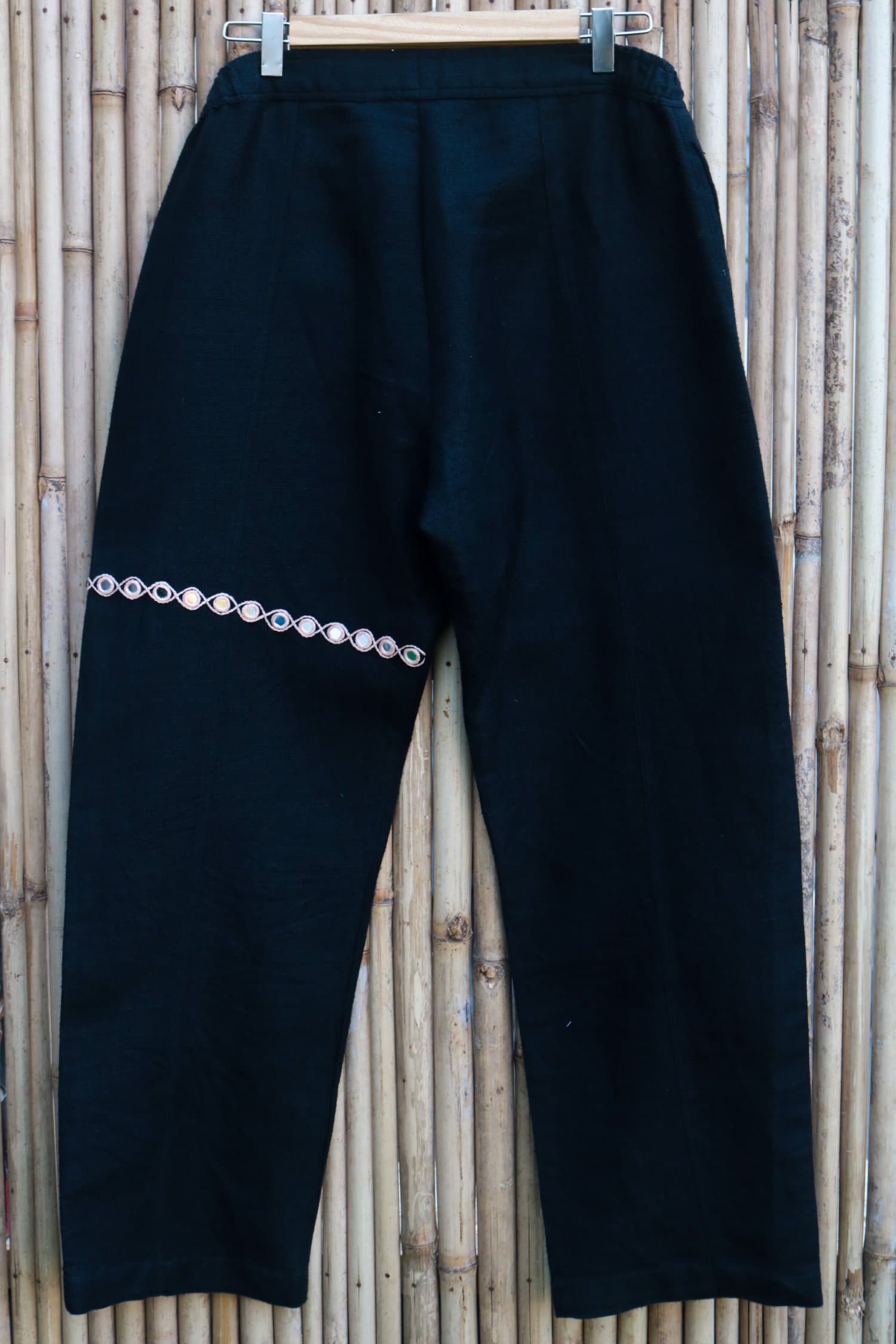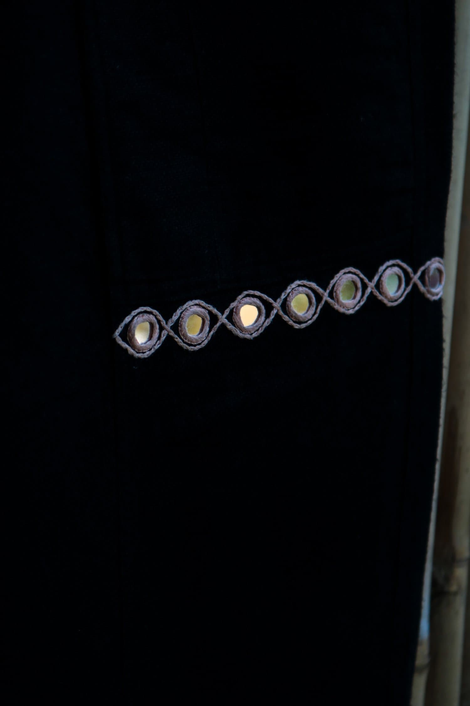 These avant-garde panel pants are crafted from durable black hemp canvas, designed to make a statement with intricate hand-embroidered recycled mirrors and cotton thread. The embroidery, inspired by DNA helixes and the mysticism of the third eye, fuses scientific precision with spiritual symbolism. Reflective mirror panels catch the light with every movement, transforming these pants into a wearable piece of art that embodies both structure and flow.