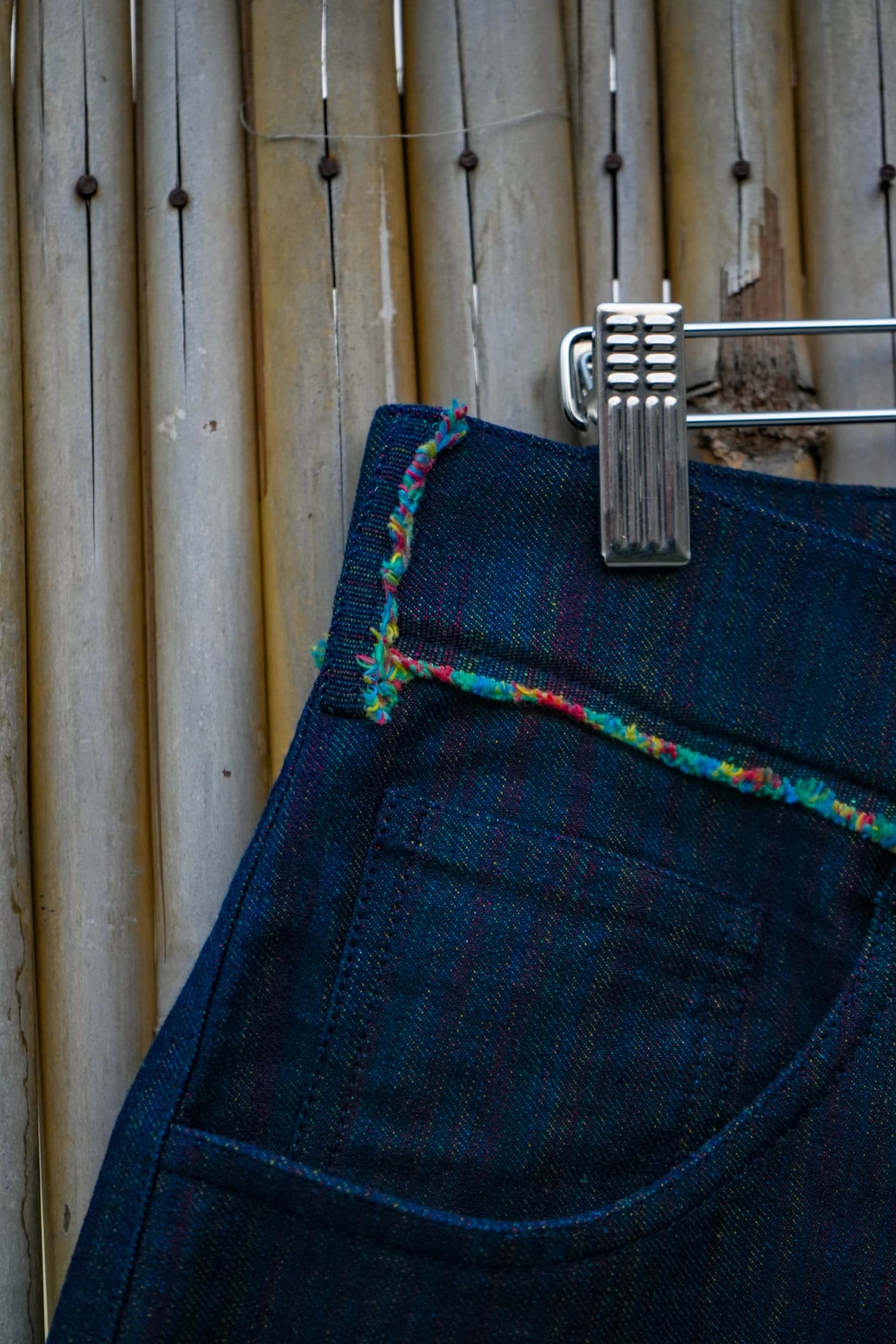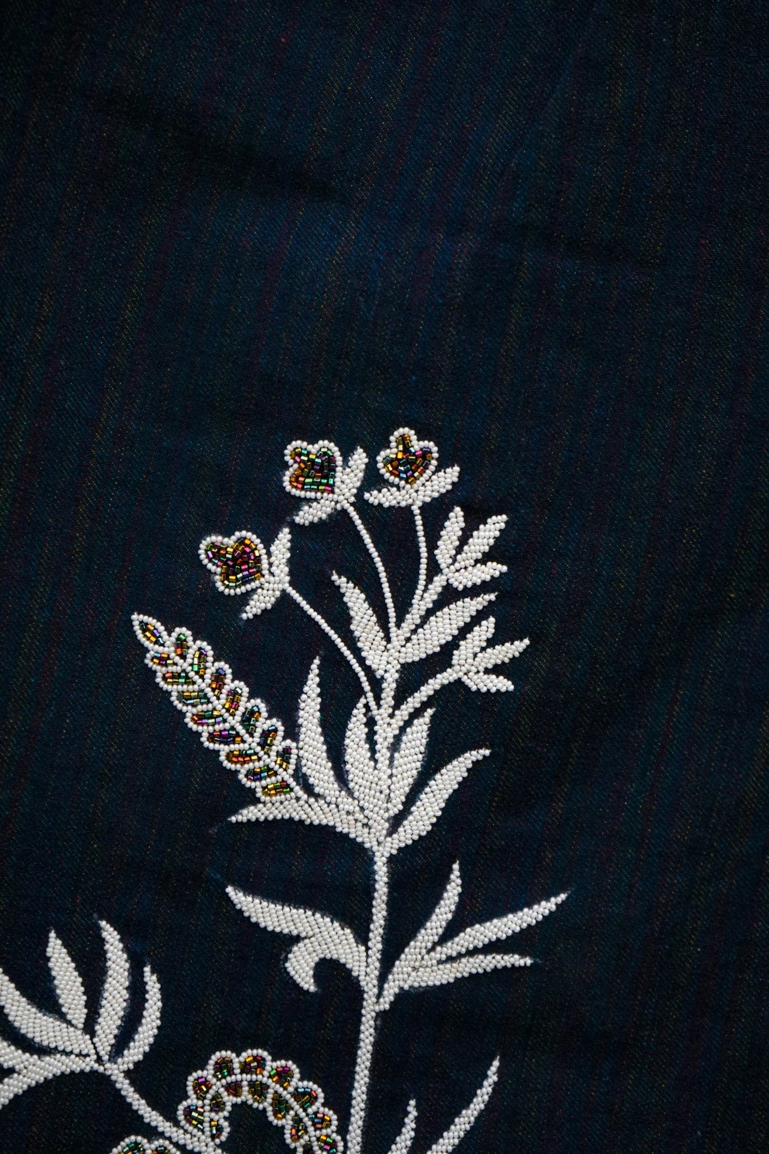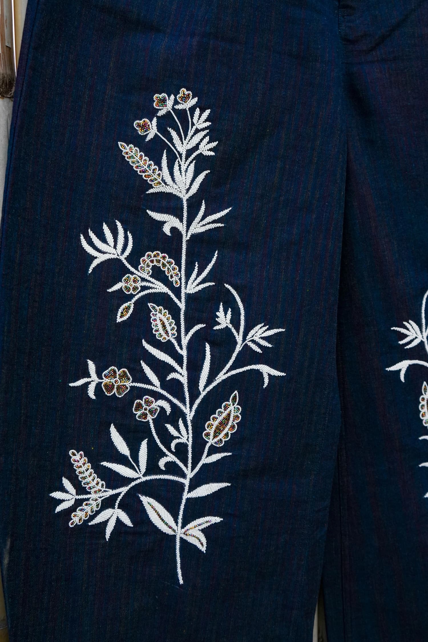 Crafted from rainbow double-sided denim, these trousers feature intricate hand-done beadwork inspired by wild florals. Finished with a relaxed silhouette, they blend playful texture with thoughtful craftsmanship for an elevated everyday statement.