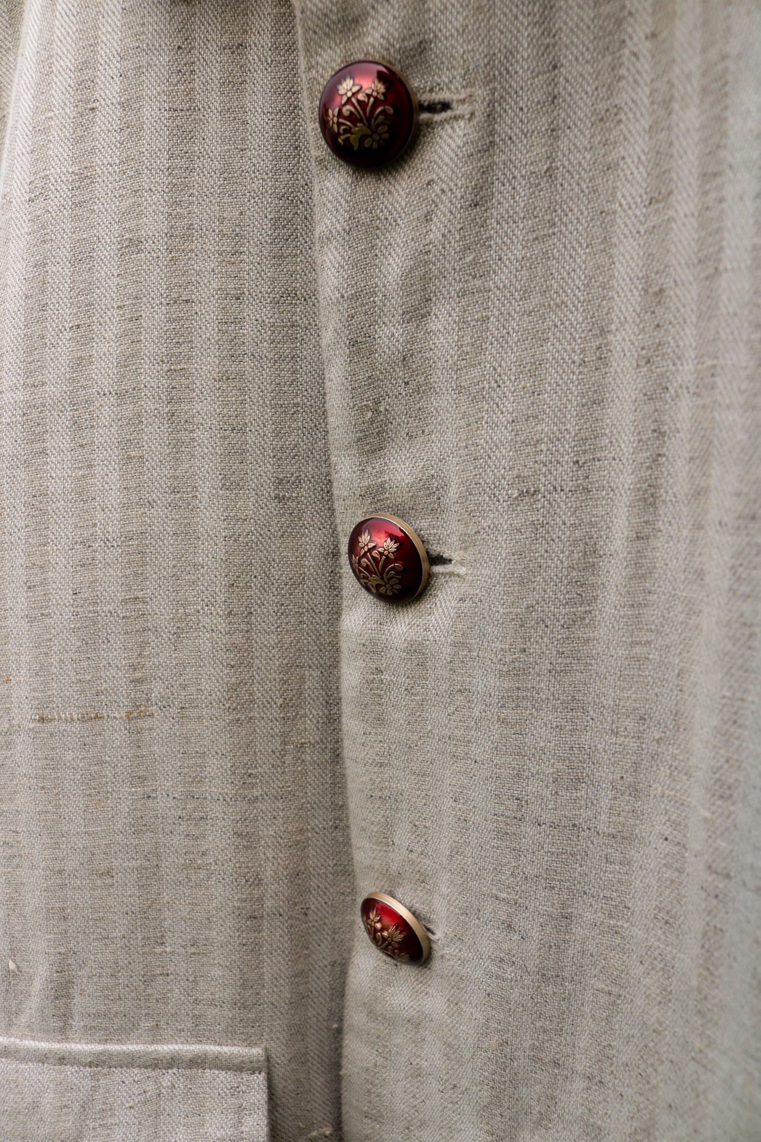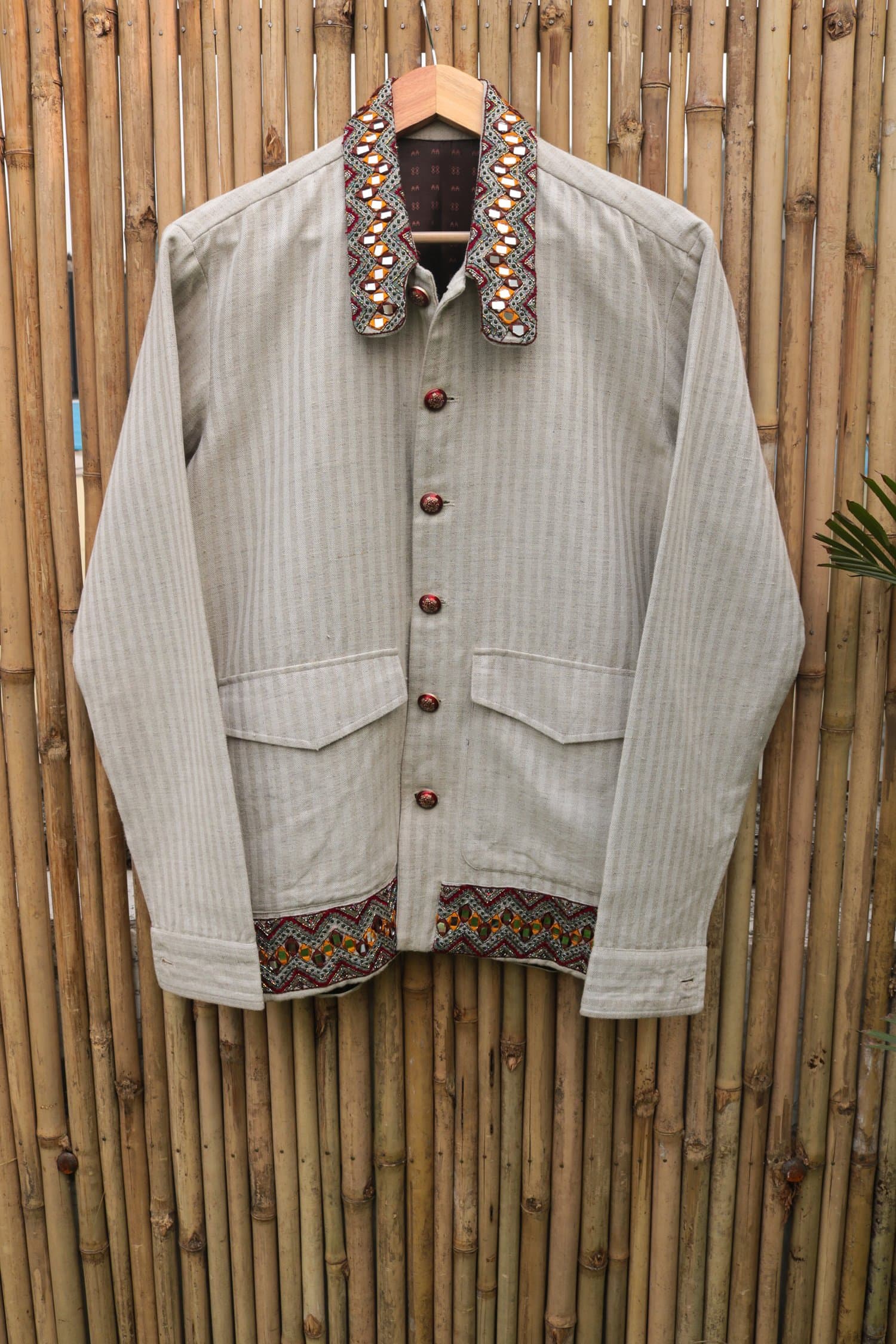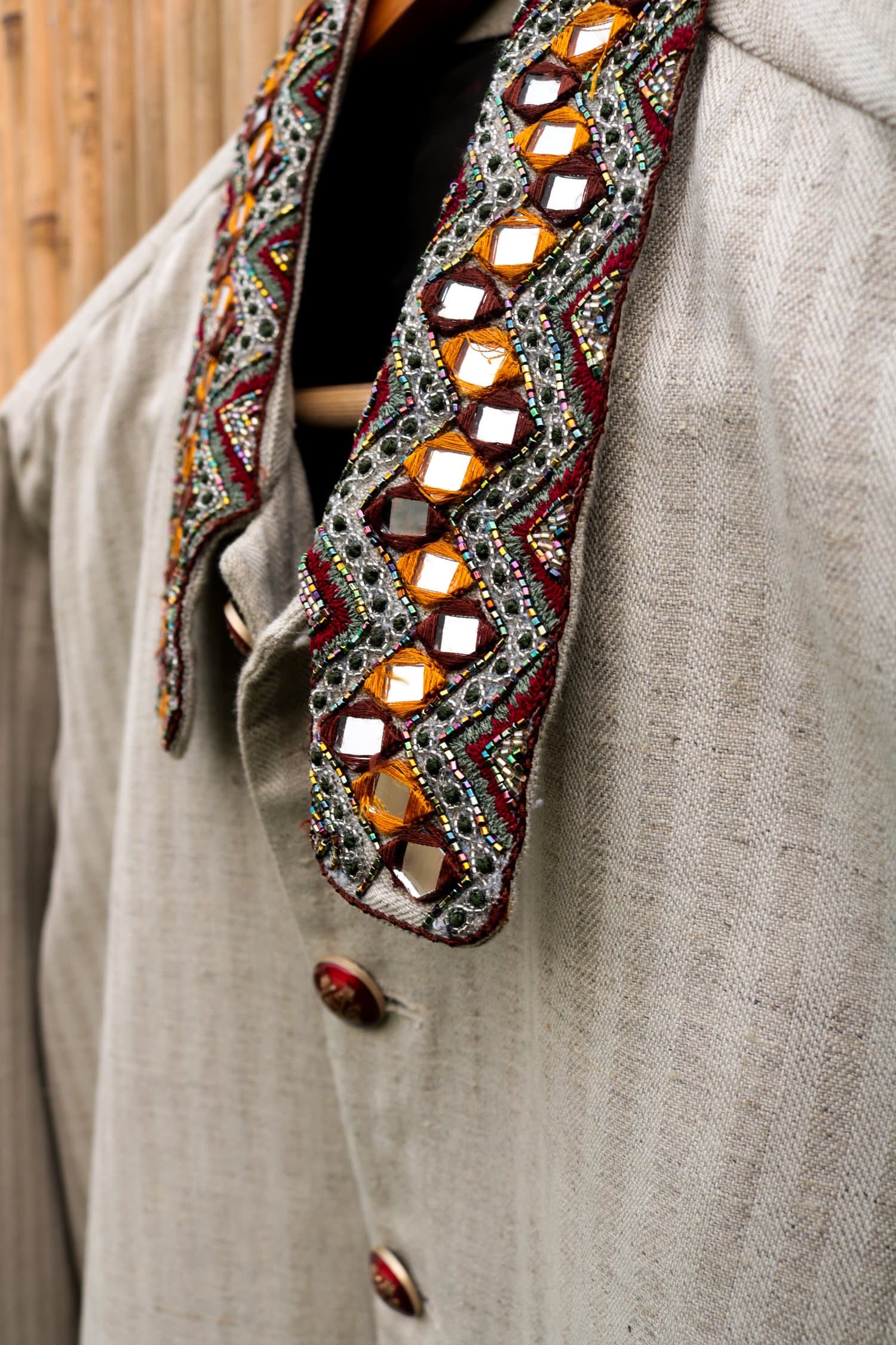 Crafted from premium hemp cotton in a herringbone weave and lined with luxurious silk, the Jaipur Jewel Jacket is a masterpiece of style and heritage. Adorned with striking red enamel buttons, this jacket exudes a sophisticated elegance. Featuring hand-embroidered bead, thread, and mirror work inspired by traditional patterns of Rajasthan, it’s a rich tapestry of East meets West.