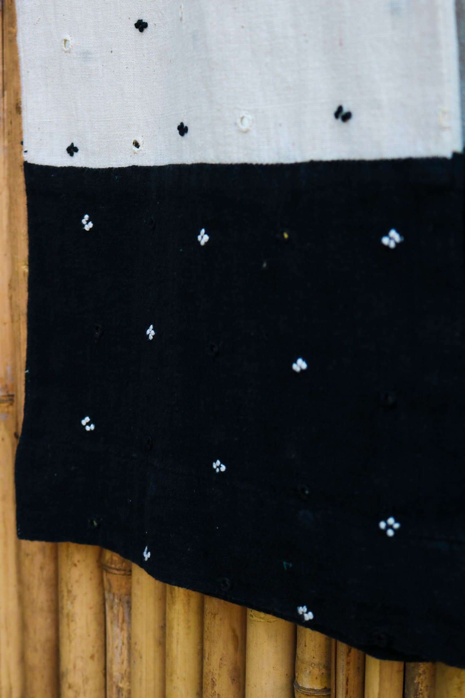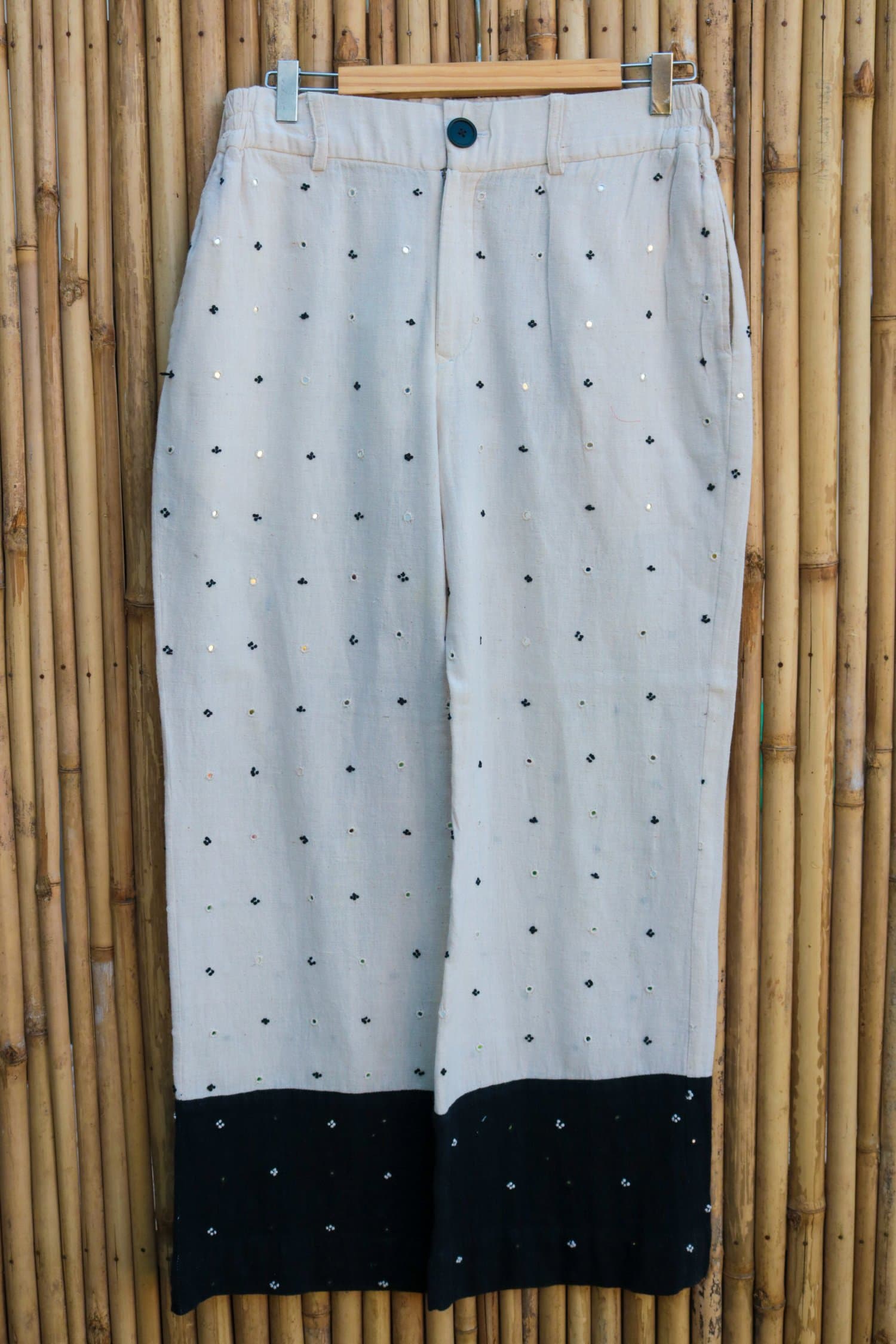 Crafted from soft kala cotton, these loose pants exude effortless elegance, adorned with intricate hand embroidery of mirrors and French knots. A perfect fusion of tradition and style, they offer a sophisticated yet relaxed fit for any occasion.