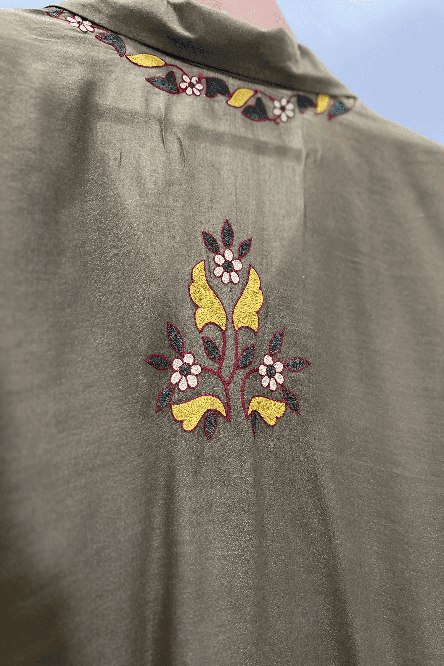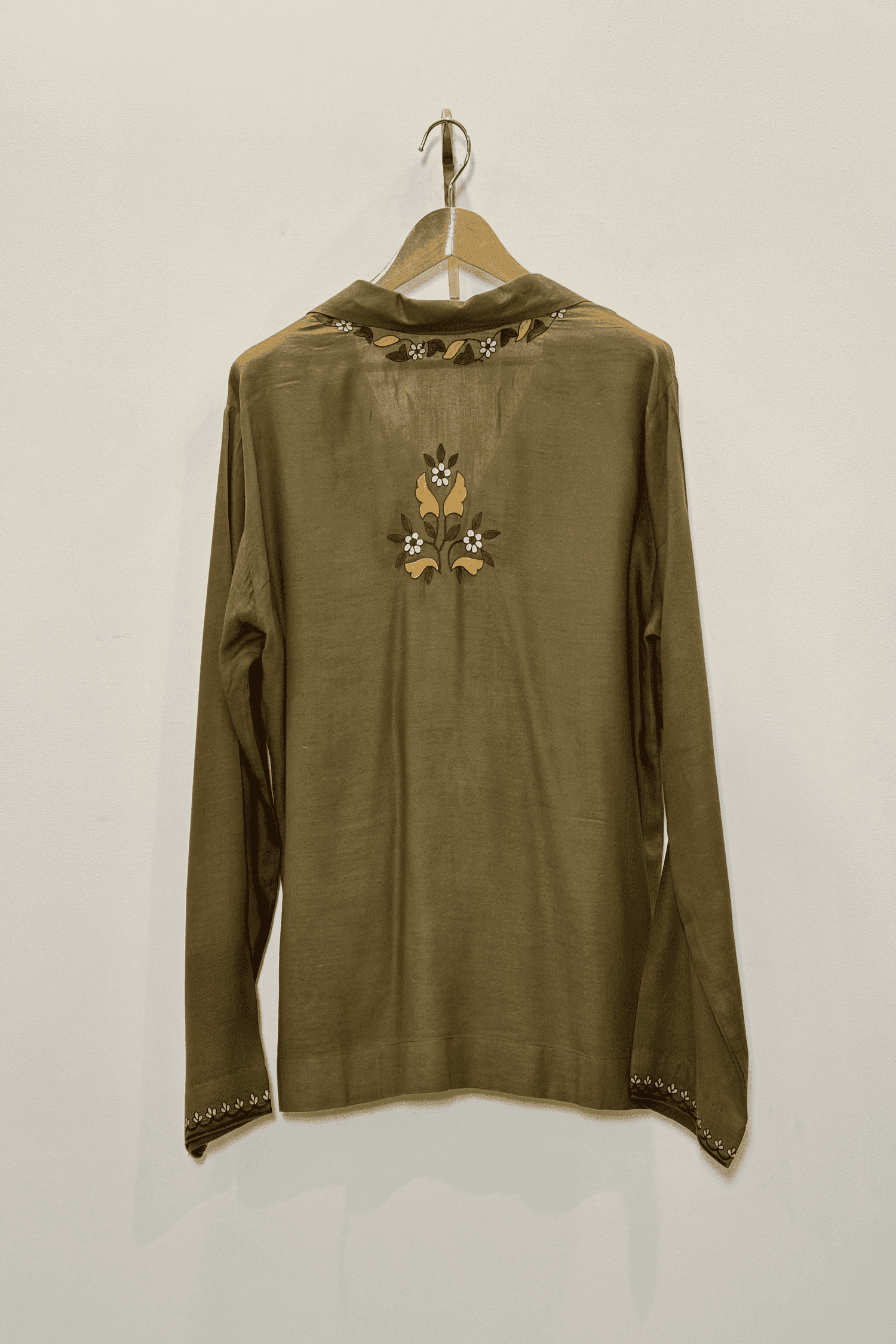 A relaxed olive top crowned with a soft collar and deep V-split neckline, where a vertical vine of mustard, crimson, and ivory florals climbs like a page torn from a 17th-century Mughal folio—quietly regal, effortlessly modern.