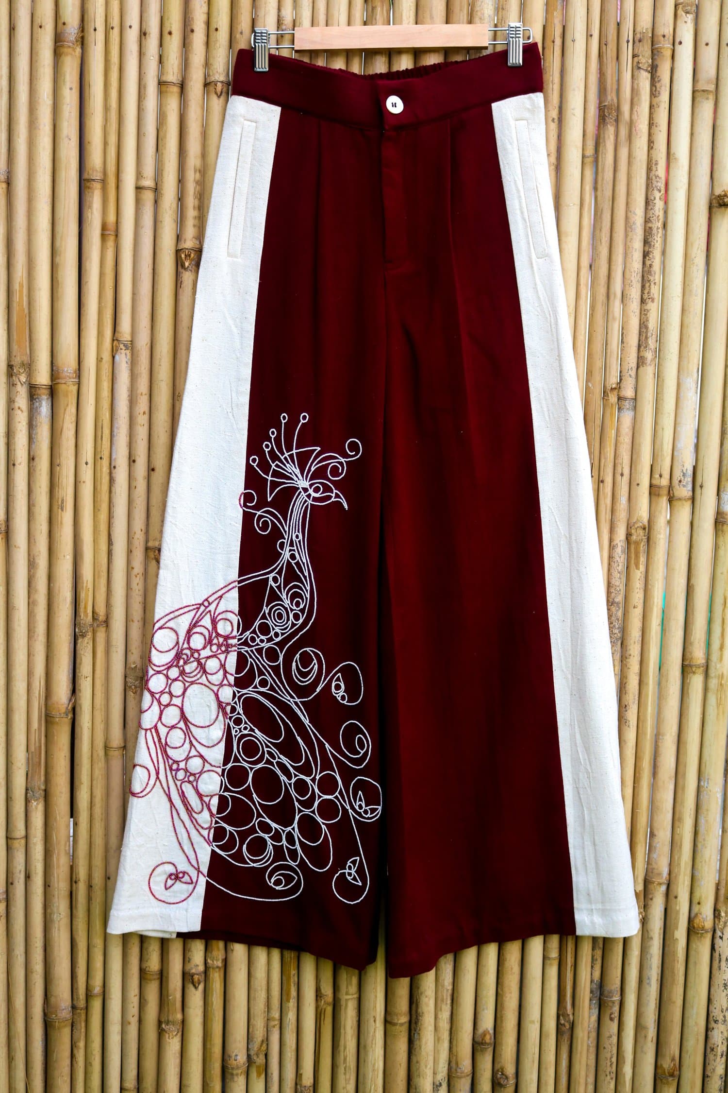 These Panel Pants are a stunning blend of artistry and elegance. Featuring striking red and white panels, they are adorned with contrasting beads that form a breathtaking peacock artwork, meticulously crafted by artist Anand Mohapatra. The intricate beadwork adds depth and dimension, transforming these pants into a wearable masterpiece that celebrates both color and craftsmanship.