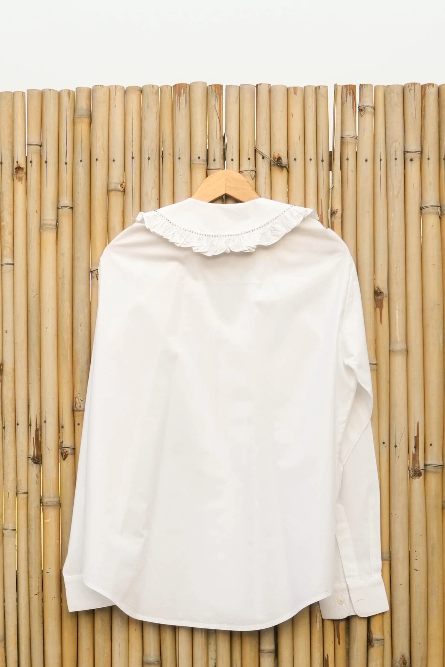 A crisp white shirt featuring a soft frill collar with delicate bead detailing. Elegant, lightweight, and thoughtfully crafted for a refined yet effortless look.