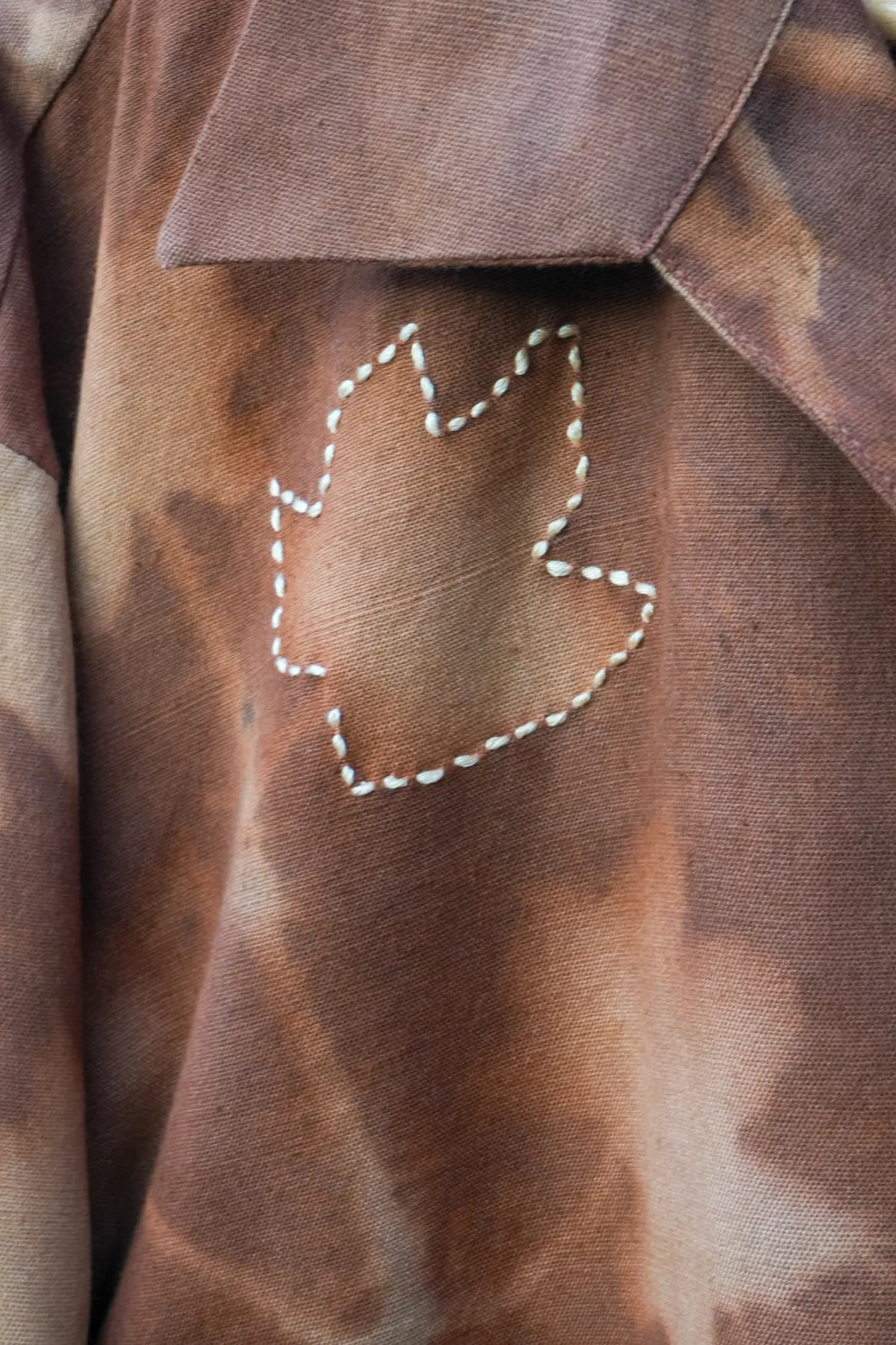 Nature, reimagined in warm earth tones, the Whispering Leaves Shirt feels like autumn caught mid-breeze. Hand-dyed leaf motifs drift across a rich brown canvas, giving this relaxed silhouette an artful, grounded presence.